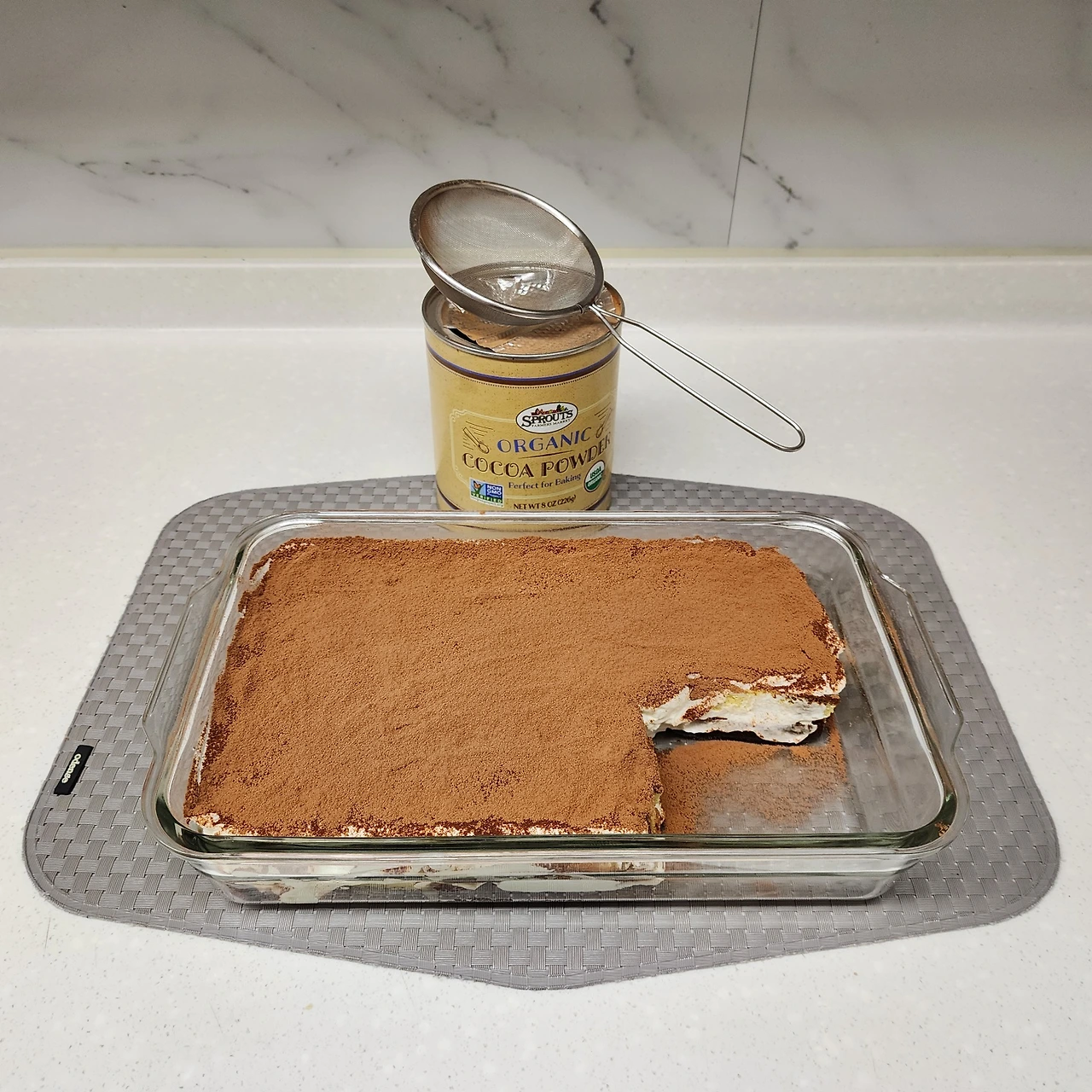 마지막으로 고운 체에 내린 코코아 가루를 살포시 접시에 뿌렸다.