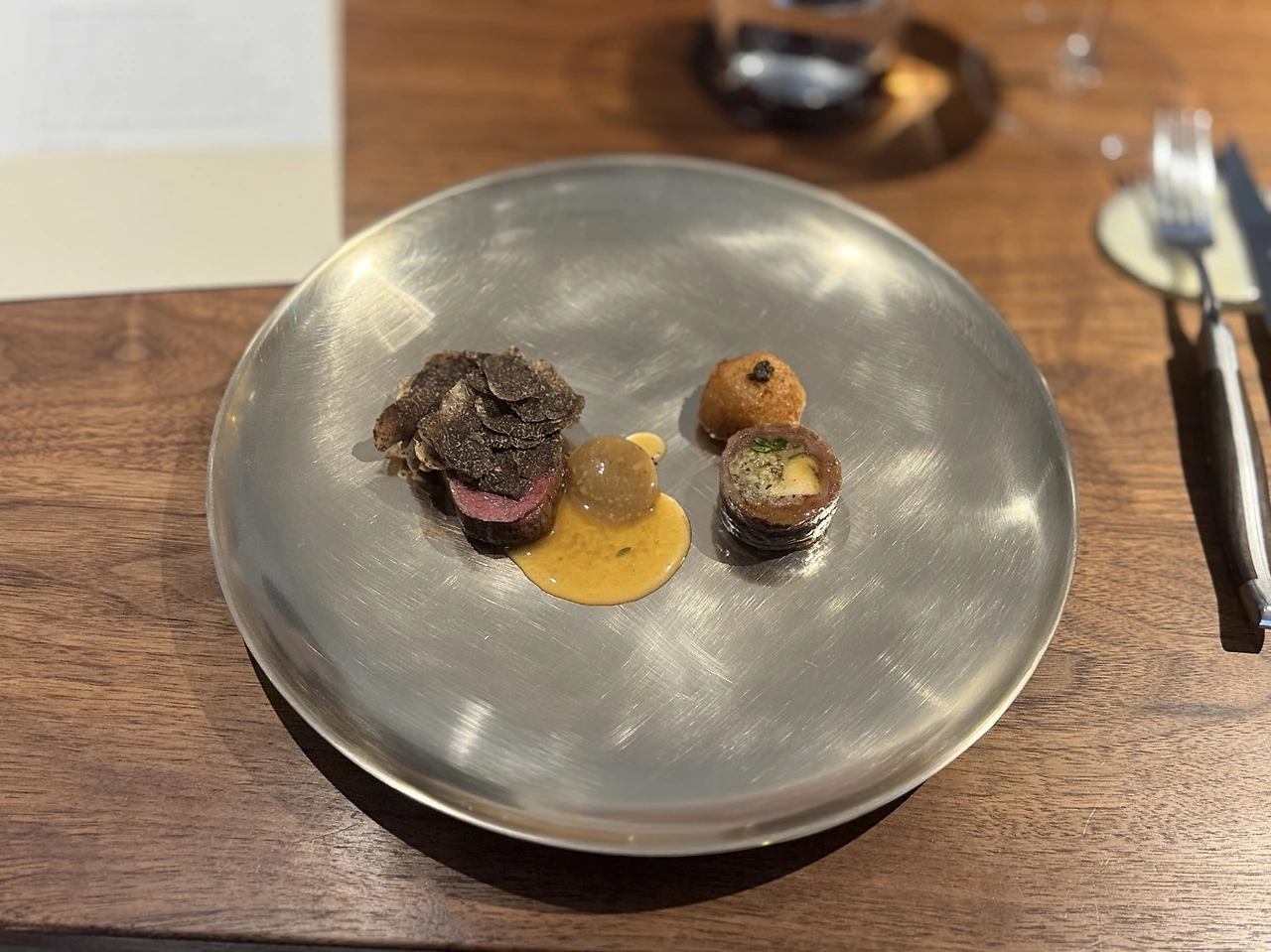 얇게 올린 트러플 향이 먼저 다가오고 부드러운 한우 한 점은 천천히 입안에서 녹는 듯 부드러웠다.