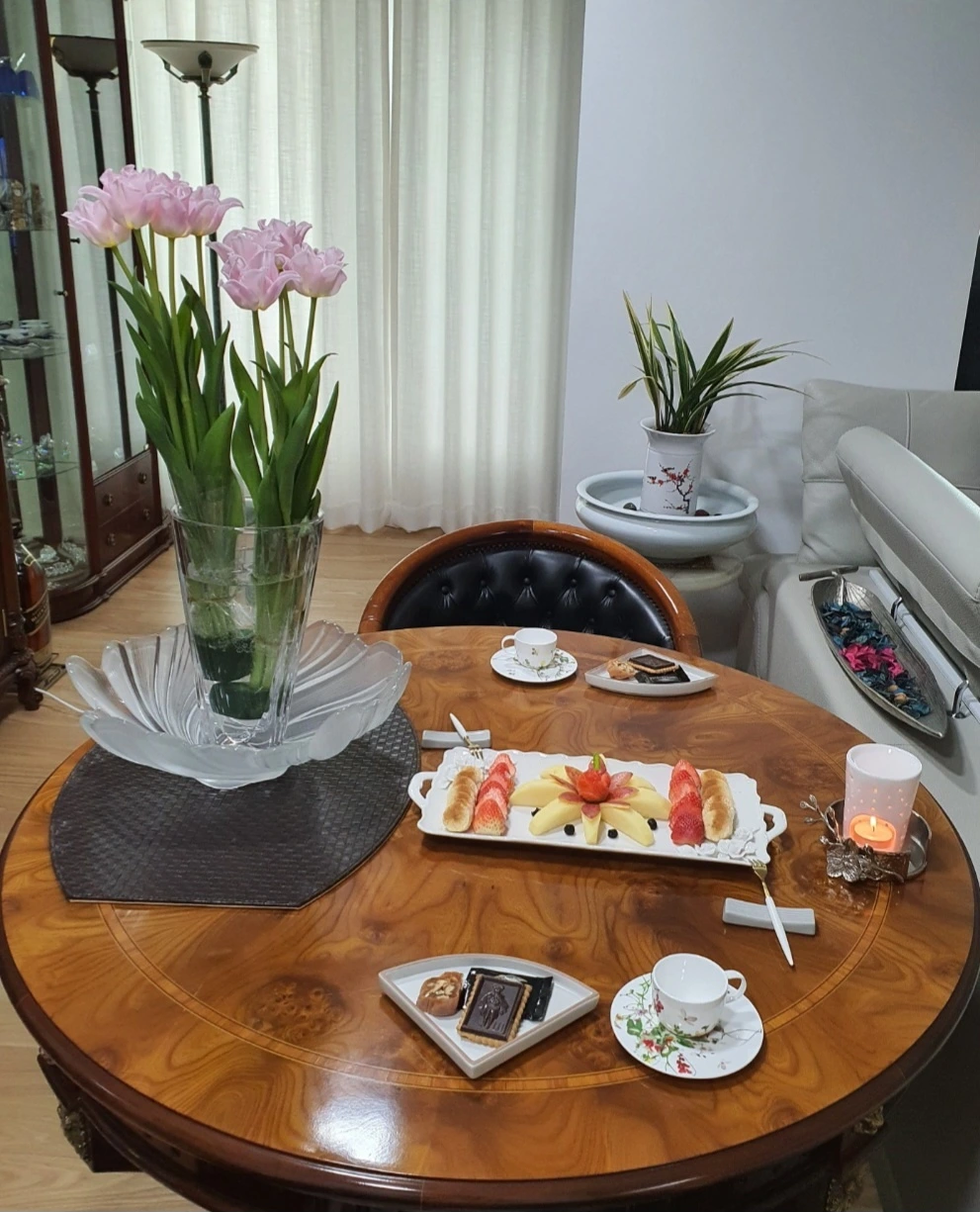 (남편과 마주 앉은 브런치 타임) 정성스럽게 플레이팅한 과일과 커피,그 곁에 예쁜 튤립이 함께...