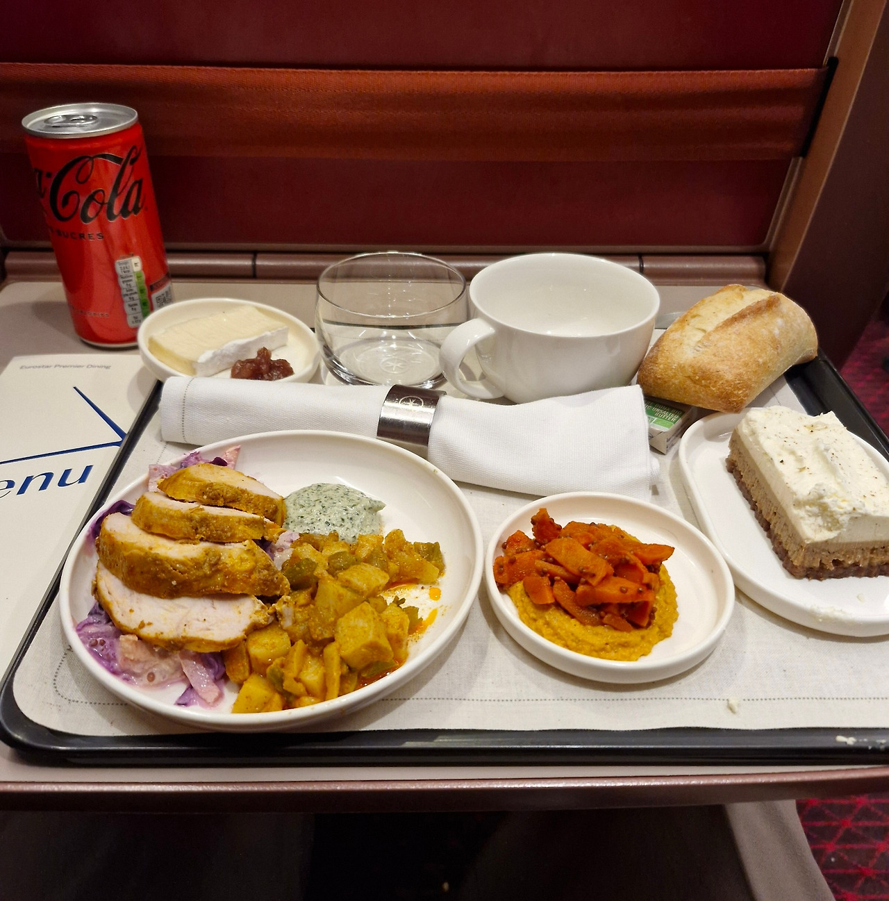 이번 출장에는 Eurostar 중 가장 높은 등급인 유로스타 프리미어를 이용했습니다. 기차로서는 가장 비싼 좌석이었지만 비행기 이코노미석보다는 꽤 저렴하고 좌석은 훨씬 편안했습니다. 이 등급은 차내식도 제공하는데 Cold food 라 별 맛은 없었지만 출발 전 기차역 주변에서 식사를 할 필요가 없어 편리했고 나름 경제적이기도 했습니다. 커피나 음료수는 원하면 계속 마실 수 있었습니다.