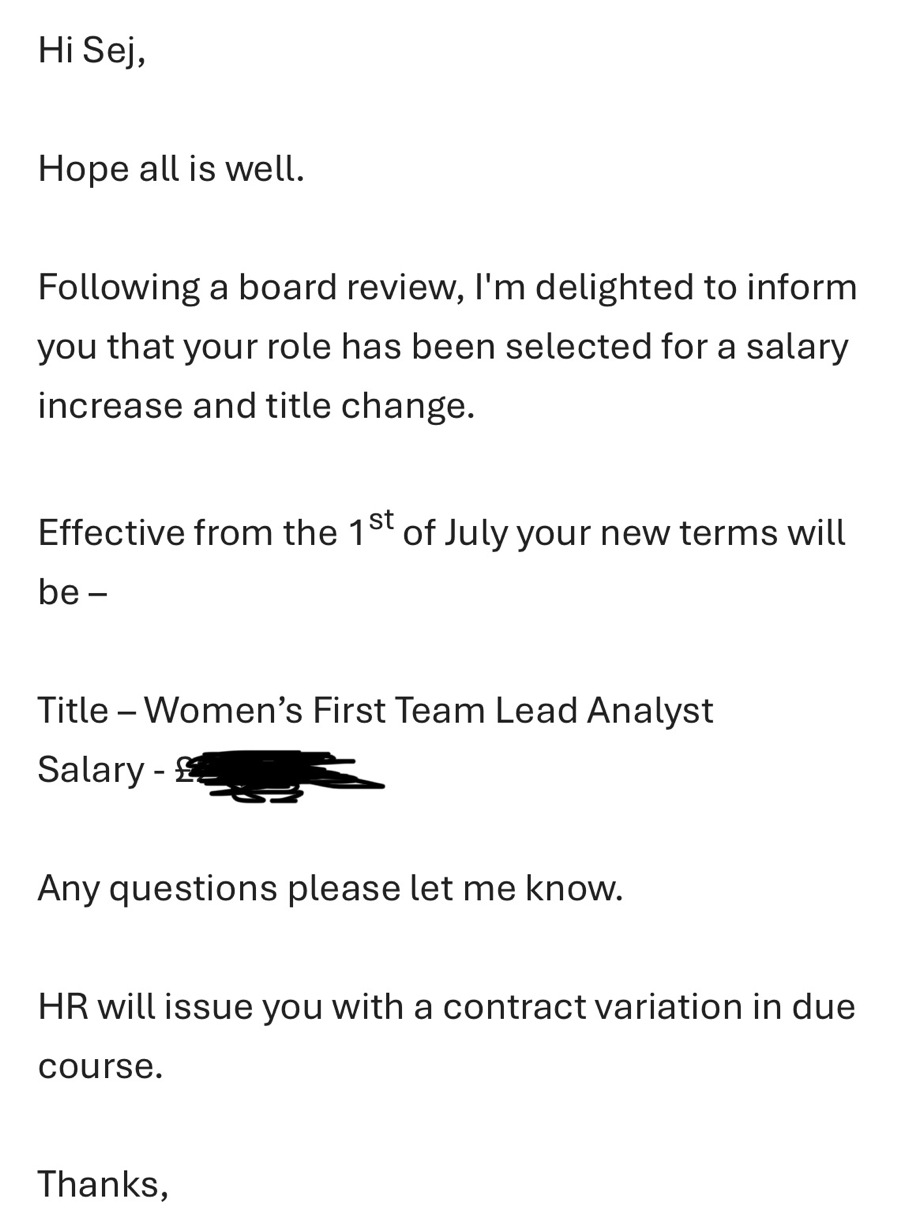 그 이후로는 정식으로 Head of football에 연봉인상 관련해서 제안서를 내고 많은 코치들과 감독들도 한 마디씩 해주면서 도움이 많이 됐다. 비록 확답을 받는데 까지 오랜 시간이 걸렸지만 긍정적으로 답변이 왔고 결론적으로는 약소하게나마 인상을 받게 되었다. 영국에서 풀타임으로 일하고 싶은 분석관분들이 요새 굉장히 많기 때문에 이런 소소한 프로세스들도 도움이 될까 해서 글을 써봤다