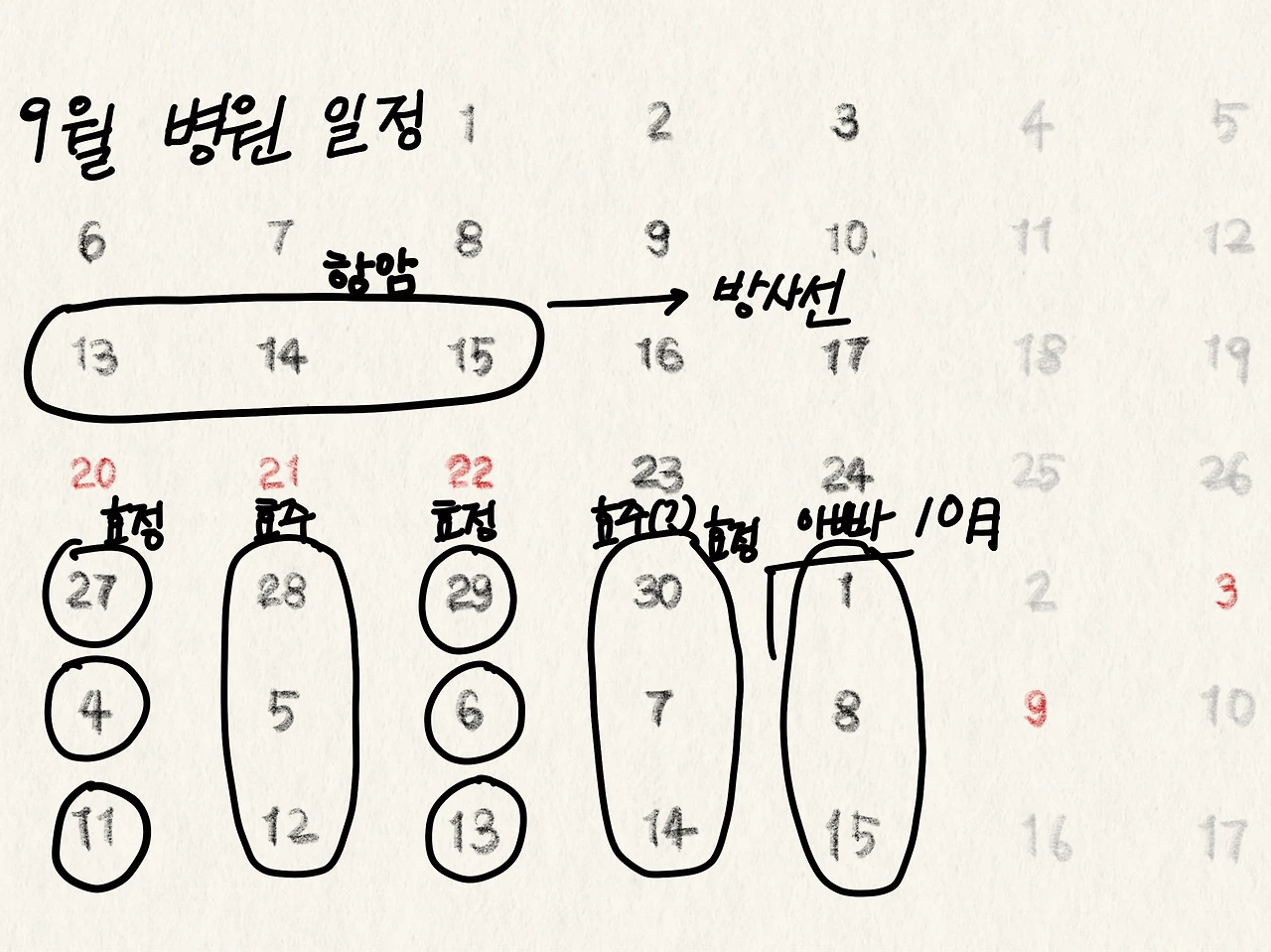 마음이 다 타들어 갈 때쯤, 병원에서 입원 안내 전화가 왔다. 면회도 안 되는 4인실, 드디어 항암치료가 시작된 것이다. 입원은 사실 자매가 예상했던 일정보다 이틀 정도 늦어졌다. 45일간의 집중 항암치료는 2박 3일 입원으로 시작되는데, 퇴원 후 통원 치료를 하다가 마지막에 다시 2박 3일 입원 치료를 한다. 방사선 치료는 치료기간 중에 주말을 제외하고 매일 15분씩 받는다. 운 좋게도 지 여사는 추석 연휴를 간당간당 피해서 겨우 입원을 할 수 있었다.