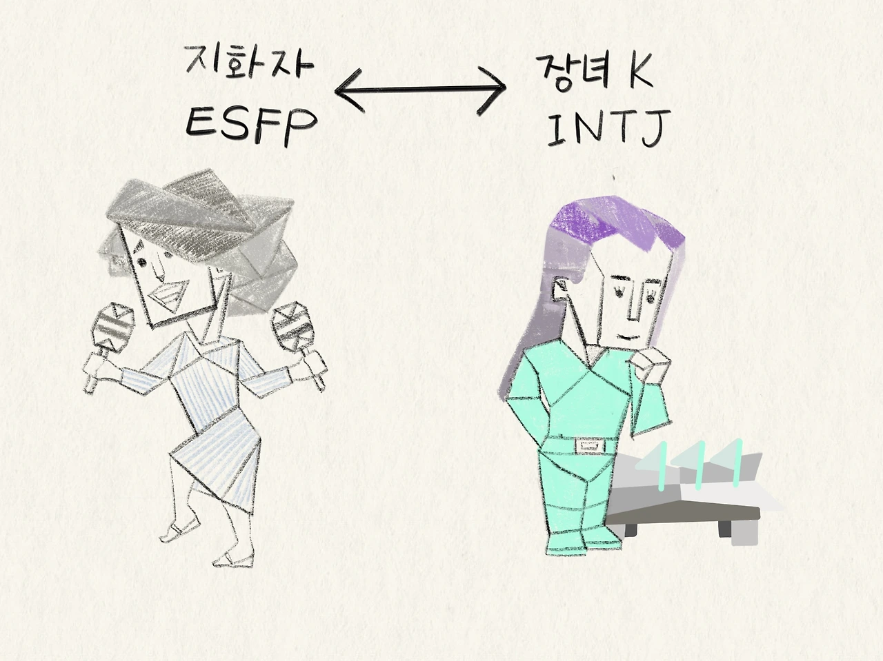 싫증 내며 뒤돌아 누운 엄마로부터 겨우겨우 알아낸 지 여사의 성격 유형은 'ESFP’, 자유로운 영혼의 연예인. 하, 어쩐지. 장녀 K는 그 대척점에 있는 'INTJ'이다. 사사건건 엄마 지 여사와 맞지 않은 것도 이해가 되었다.
