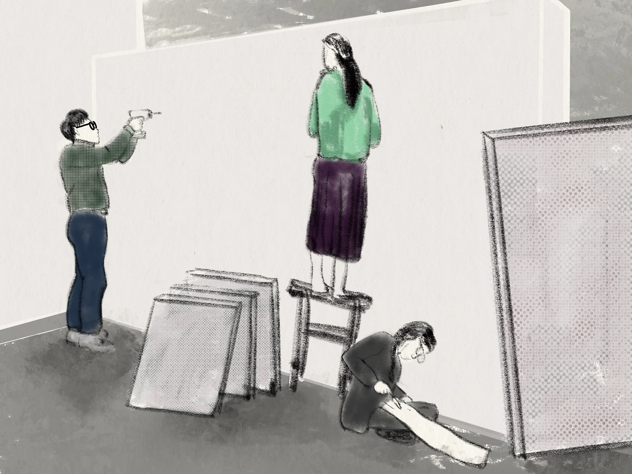 매주 월요일, 장녀 K는 홍대 부근에 있는 크로키 모임에 나간다. 그림을 그리다 보면 머리 아픈 일들을 잊을 수 있어 장녀 K에게는 소중한 시간이다. 함께 크로키를 하면서 친해진 작가 A가 개인전을 가졌다. 코로나19로 어려웠던 시간들, 작가 A의 현실적 고뇌와 고통이 남일 같지 않았다. 전시 마지막 날, 작가 A를 도와주러 장녀 K는 전시장에 갔다. 때마침 구 이사님이라고 불리는 분도 전시 철거를 도와주려 왔다.