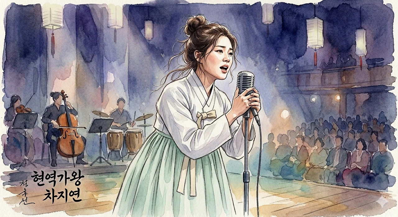 차지연은 촌스러운 한복을 입고 화장기 없는 얼굴로 무대에 섰다.