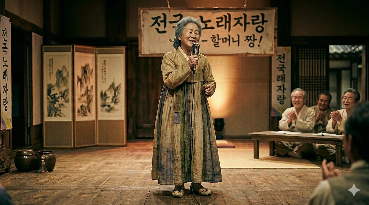 "팔십세 살 먹은 정애심입니다. 나가 꿈이 가수였는디 우리 마을에 노래자랑 방송국이 와서 고맙습니다."