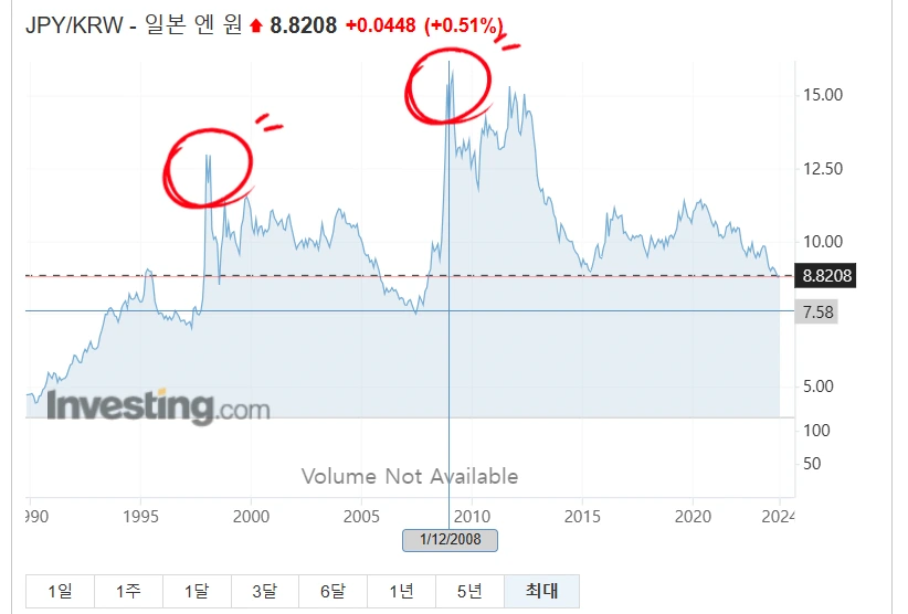 과거 일본 엔원차트를 볼게요.