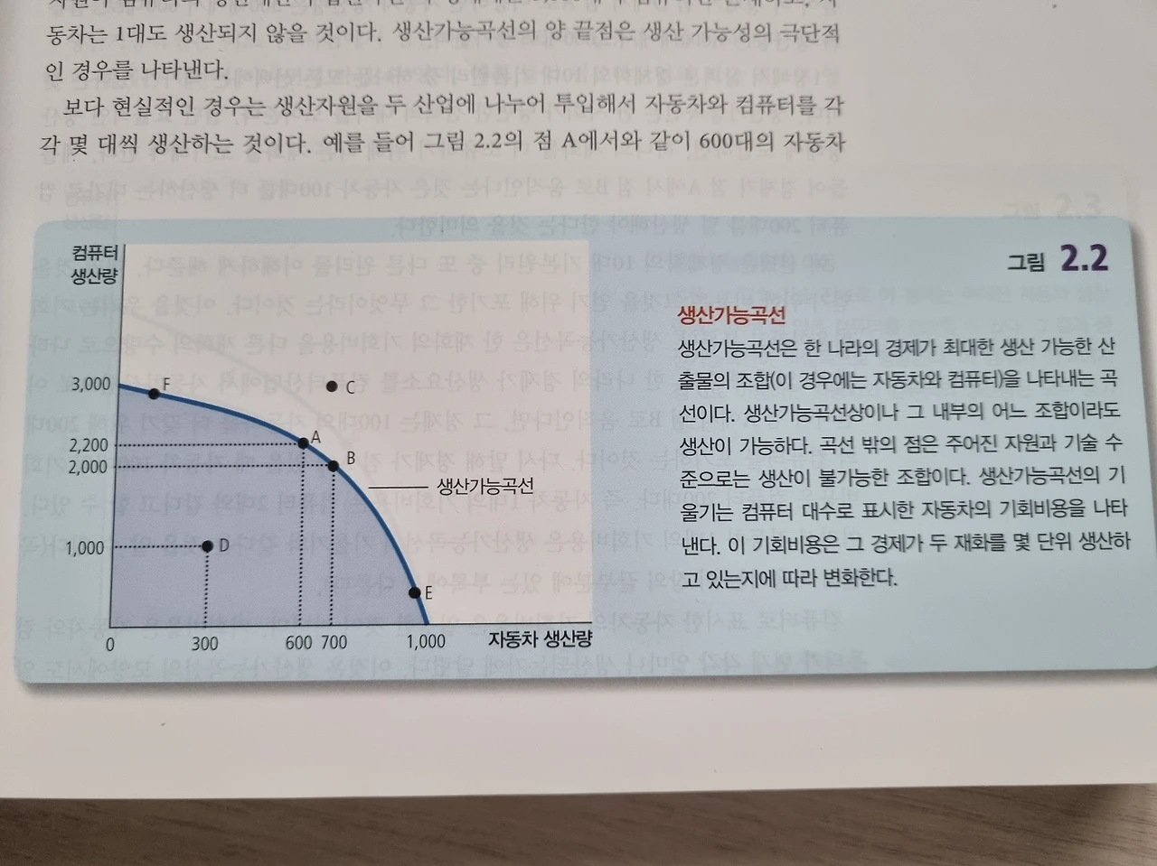 - 점 F와 같이 생산가능곡선의 기울기가 매우 완만할 때, 즉 자동차 생산량이 적고 컴퓨터 생산량이 많을 때 자동차의 기회비용은 매우 낮음.