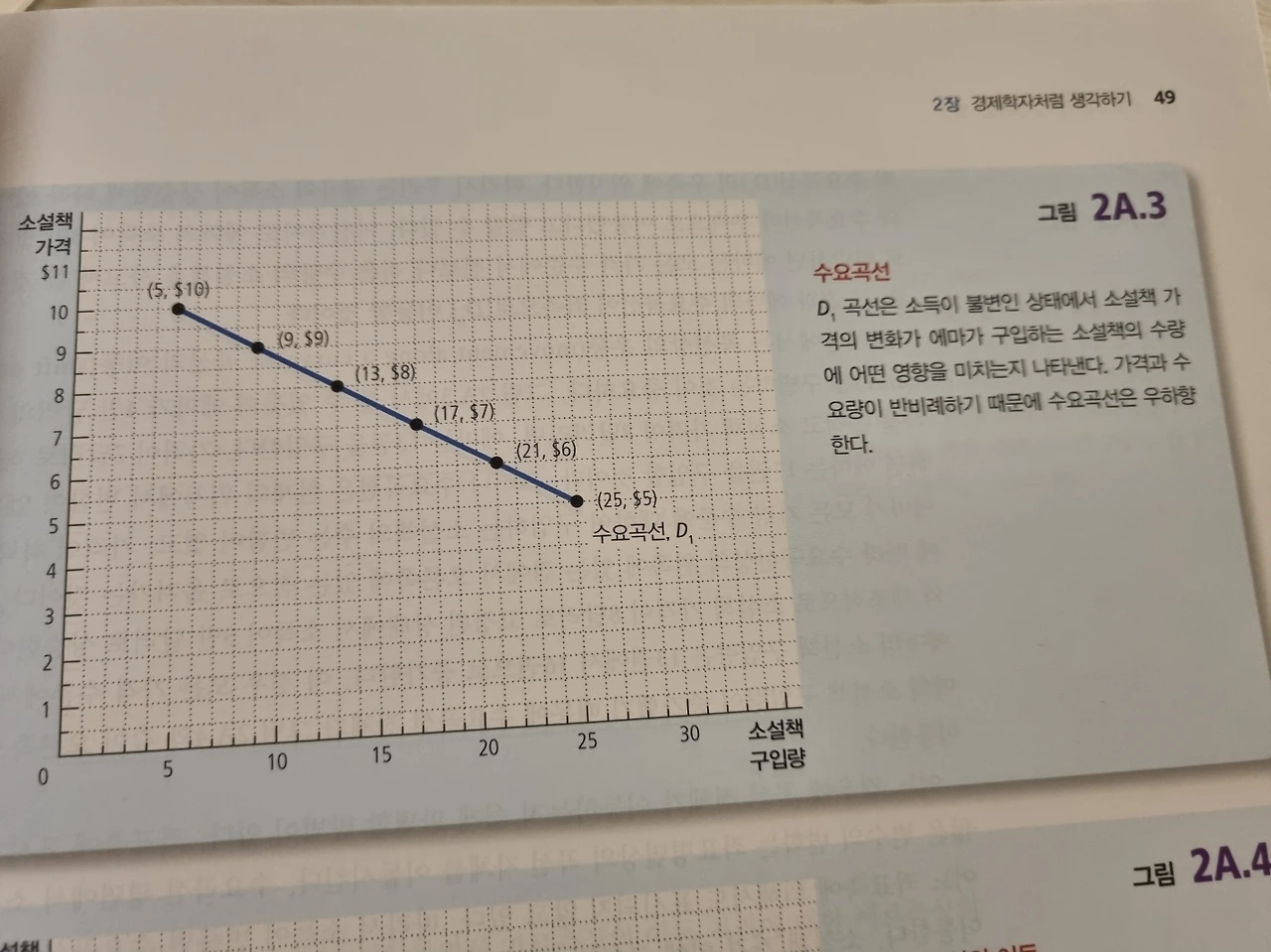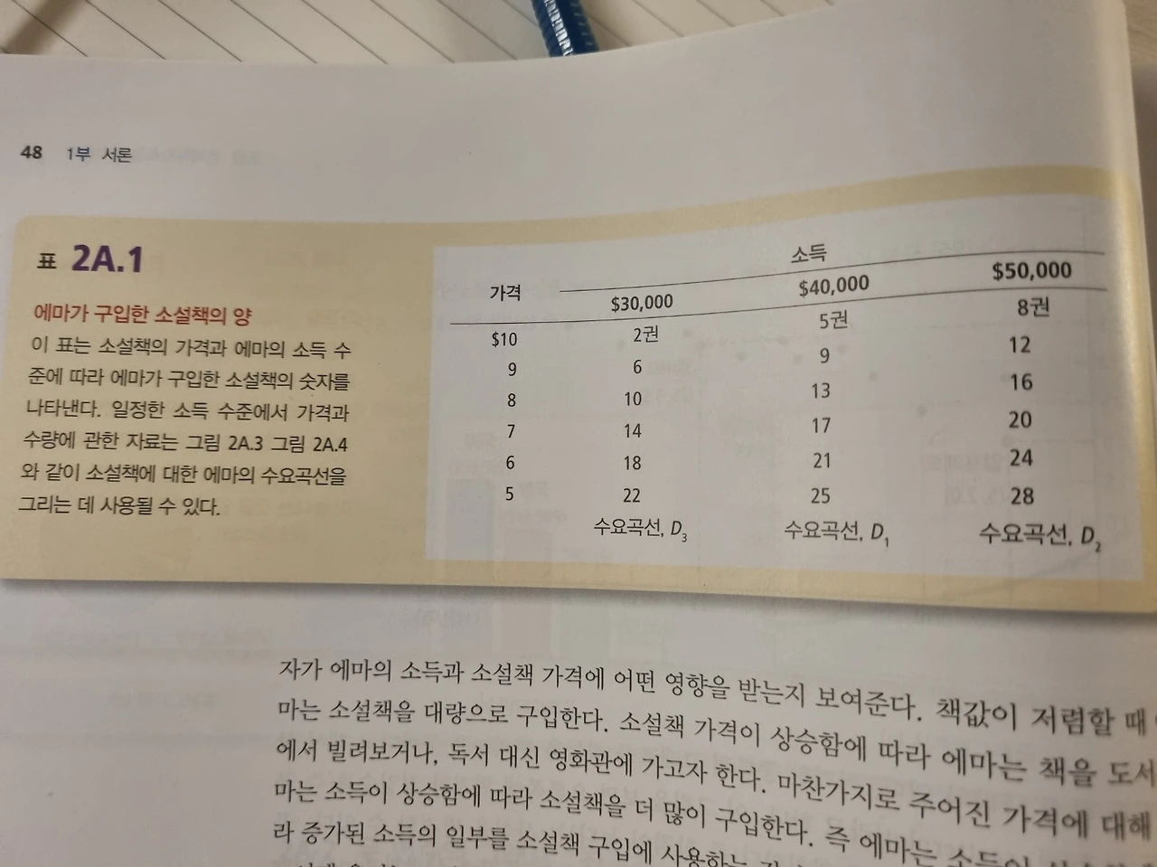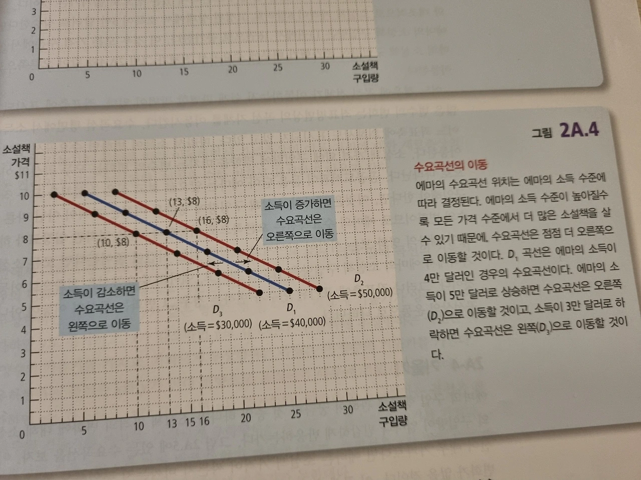 그림 2A.4에서 D1 -> D2로는 4만 달러에서 5만 달러로 에마의 소득이 증가함에 따라 소설책의 수요량이 증가한 것을 볼 수 있으며, 그에 따라 에마의 수요곡선은 우측으로 이동했다. 반면 D1 -> D3로는 4만 달러에서 3만 달러로 에마의 소득이 감소하며 에마의 수요곡선이 좌측으로 이동했다.