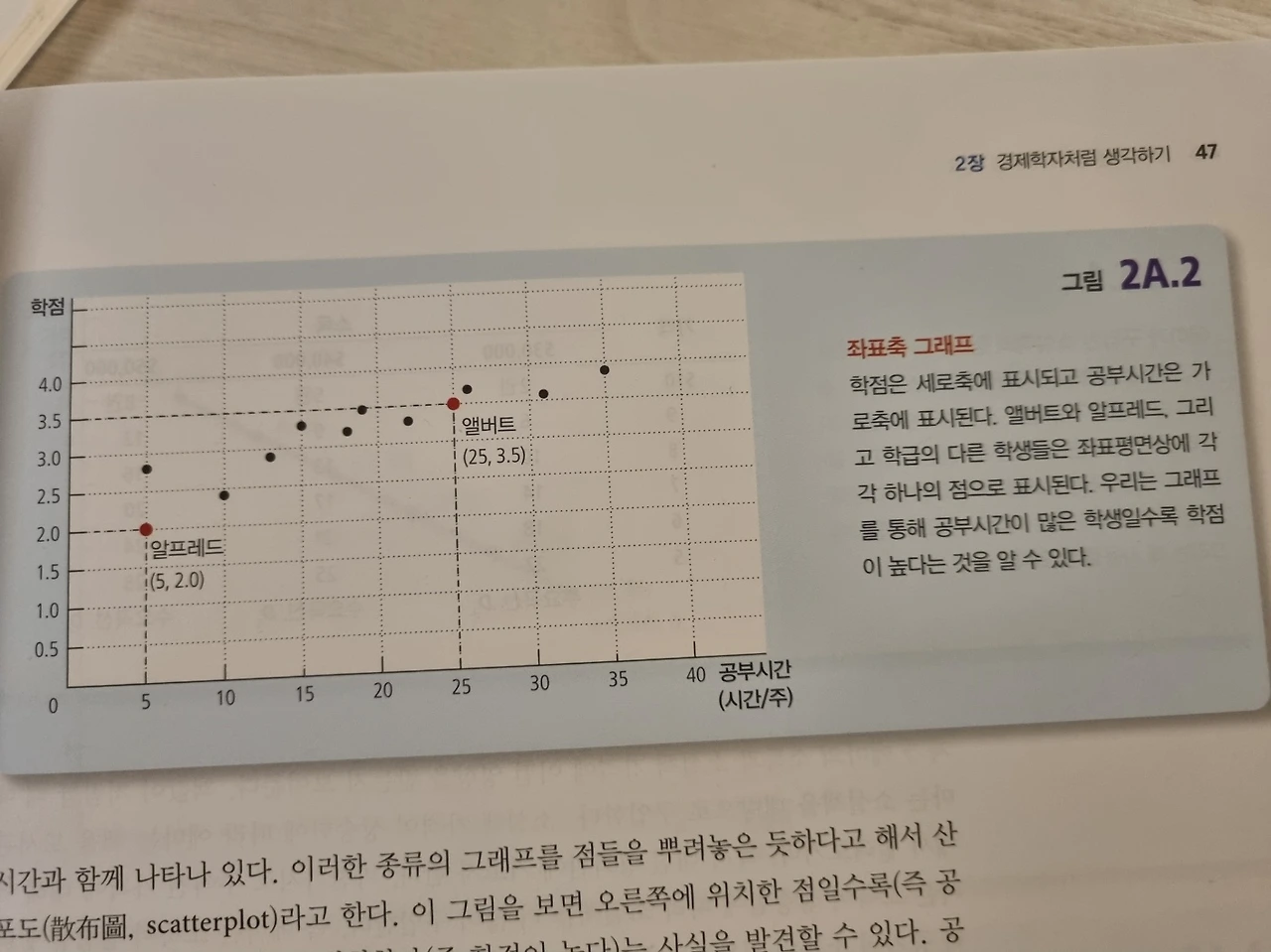 그림 2A.1에 있는 세 가지 그래프는 한 변수가 시간이나 대상 등에 따라 어떻게 변하는지 보여주는 데에는 매우 유용하지만 하나의 변수에 관한 정보만 전달하므로 두 변수를 하나의 그래프에 동시에 표시할 필요가 있을 때에는 좌표축(coordinate system)을 활용한다.
