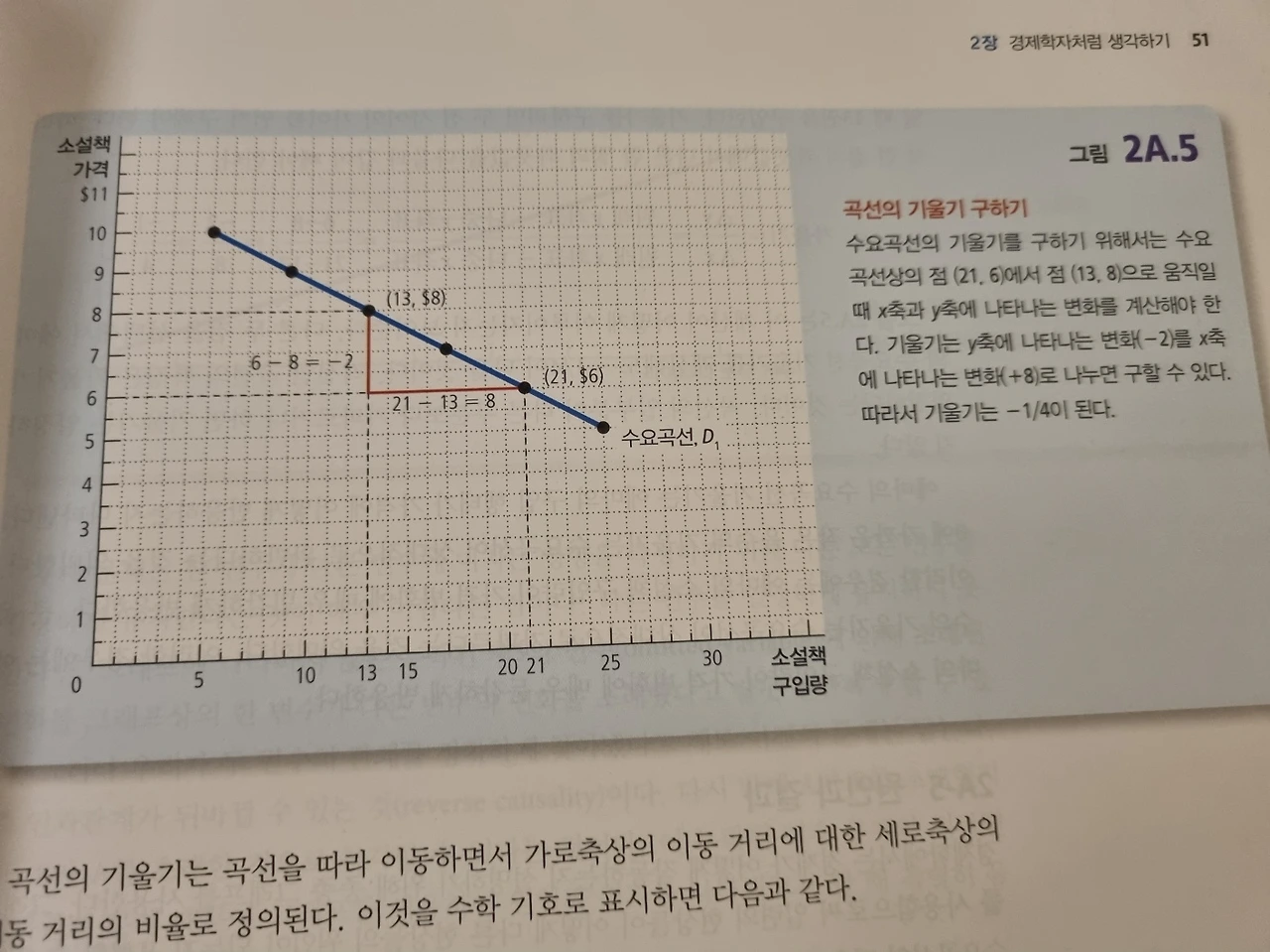 위 그림에서 곡선이 매우 가파르다면 에마가 소설책을 구입하는 수량은 가격에 큰 영향을 받지 않을 것이고, 곡선이 매우 완만하다면 가격이 상승할 경우 구입량은 급격히 감소할 것이다. 이처럼 한 변수의 변화에 대하여 다른 변수가 얼마나 반응하는지 보기 위해서 기울기(slope)라는 개념을 사용할 수 있다. 곡선의 기울기는 곡선을 따라 이동하면서 가로축상의 이동 거리에 대한 세로축상의 이동 거리의 비율로 정의할 수 있으며, 이를 수학 기호로 나타내면 “ 기울기 = Δy / Δx ” 와 같다. 앞에서 그리스 문자 Δ(델타)는 변수의 변화량을 의미하여 곡선의 기울기란 y의 변화량을 x의 변화량으로 나눈 것이라 할 수 있다.