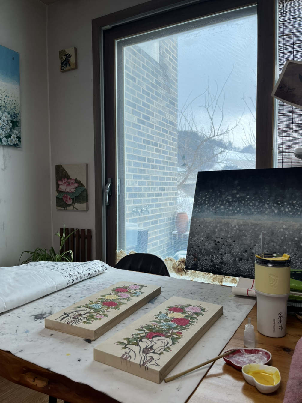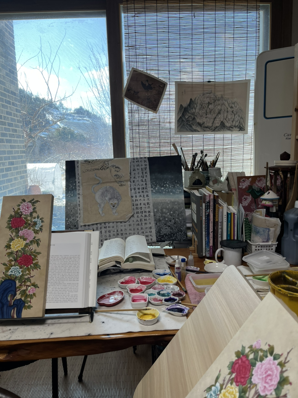 서너 평에 먹고 자고를 제하고 열두어 시간의 루틴을 만들었다. 당연 출퇴근에 소요되는 시간은 거의 없다. 쓰고, 읽고, 그리고, 짓는다. 요일을 정해 매트를 깔면 헬스케어까지 가능하다. 그림을 그리다 책도 읽다, 그도 싫증이 나면 차도 한 잔 마시다가, 학기공부하고 있다 생각하고 시작한 매일의 루틴을 실현하면서 서양미술사에 중국미술 그리고 한국현대미술 책을 번갈아 가며 그림을 탐독하며… 앞선 사람의 뒤꿈치는 왜 그리 멀기만 하는 걸까?