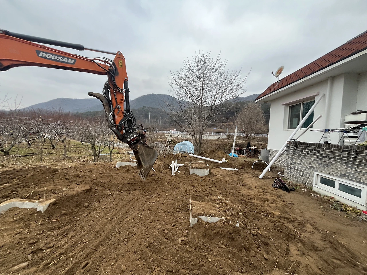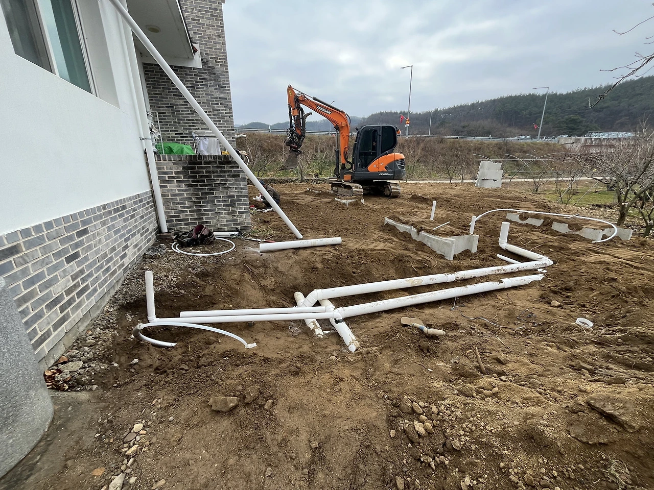 장비는 동네 것을 사용하고, 연계된 배관 공정은 위탁주는 형태로 추진했다. 다만, 모듈러 주택 시행사가 주문한 터 조성 공정에서 견고성을 높이기 위해 경계석을 사용하였는데, 체류형 쉼터는 콘크리바닥을 할 수 없어 그에 상응하도록 했다. 또한 정화조는 본 건물의 용량을 애초에 큰 것을 묻었던 거라 별도로 하지 않고 신청할 수 있었다. 해서 수도와 오폐수관은 본 건물의 것을 연장해 사용, 설치가 시작되면 전기 또한 본 건물에서 연결하는 공정으로 계획했다.