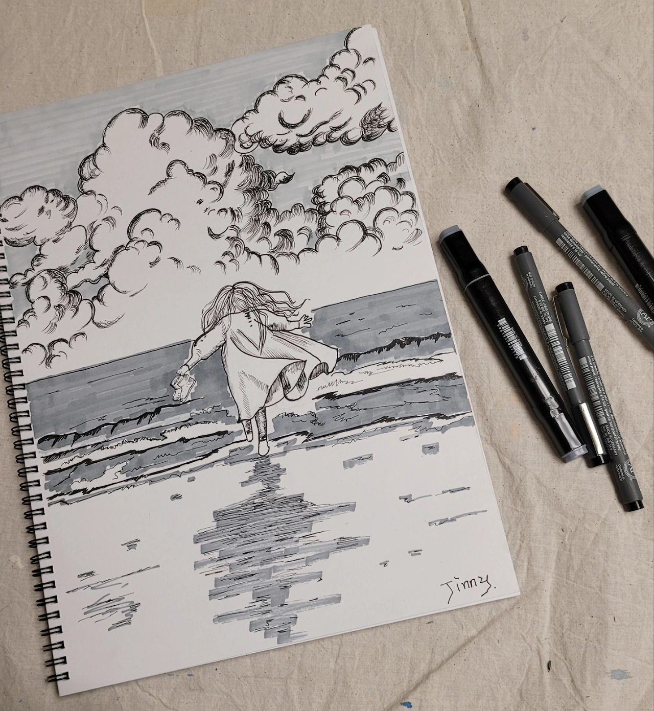 선생님과 수업 첫 시간 오랜만에 펜화를 그리고 싶어 핀터레스트를 검색해 모사할 그림을 골랐다. 역시나 뒷모습. 아직 선생님과 그리 친해지지 않아서 내 속사정을 말씀드리지 않고 그림을 그렸다. 그림은 마음에 들었다.