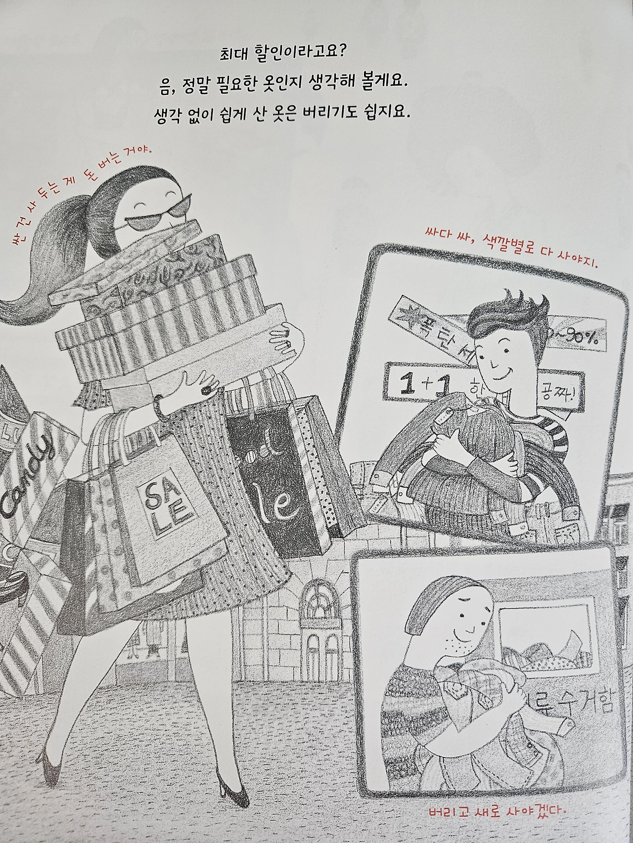 그림책 '미미의 스웨터'는 착한 소비에 대해 이야기한다. 미미는 유행을 좇지도 않고 불필요한 옷을 사지 않는다. 고쳐 입고 자신만의 개성이 드러나는 옷으로 꾸미기도 한다. 작아서 입지 못하는 옷을 모아 벼룩시장에 판매해 새 주인을 찾아준다.