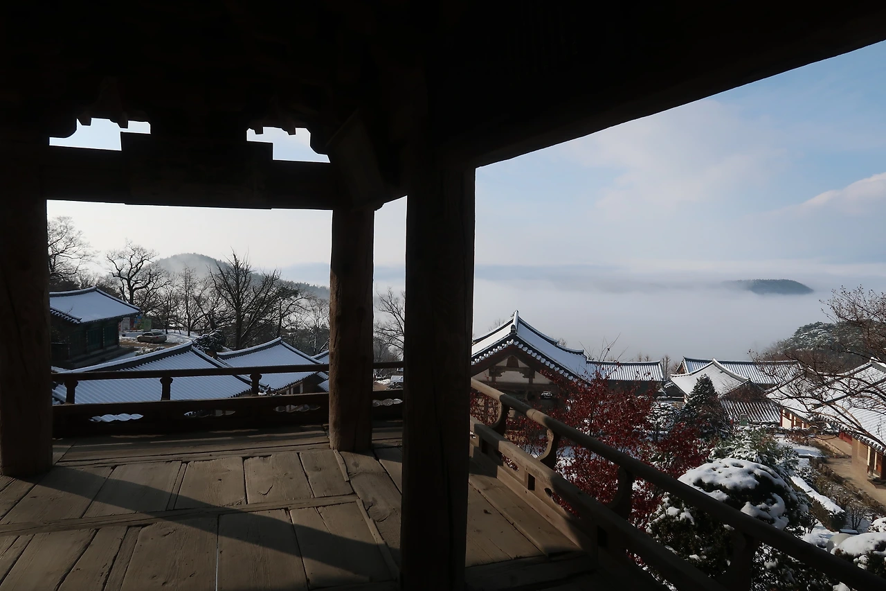 10-9. 겨울철 안양루 기둥 사이로 선명하게 보이는 안산의 존재.