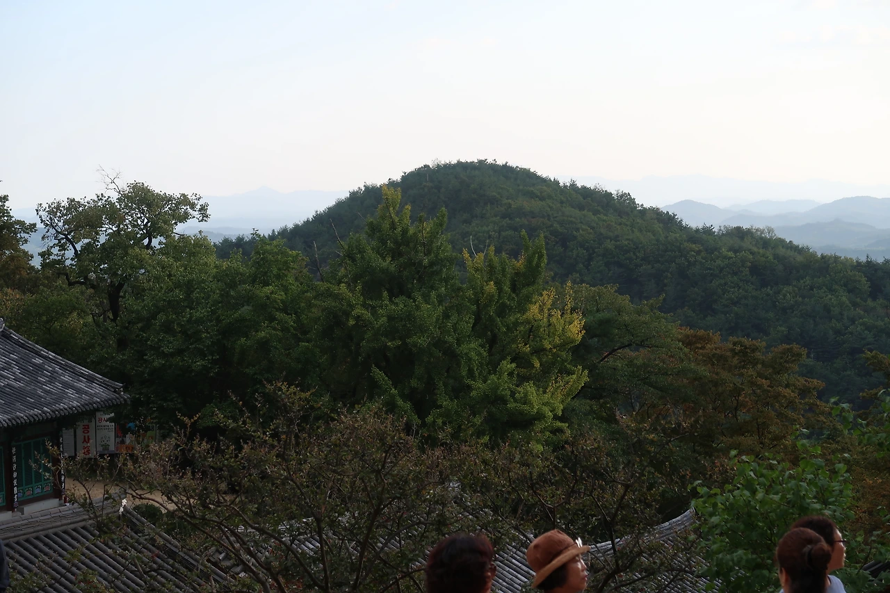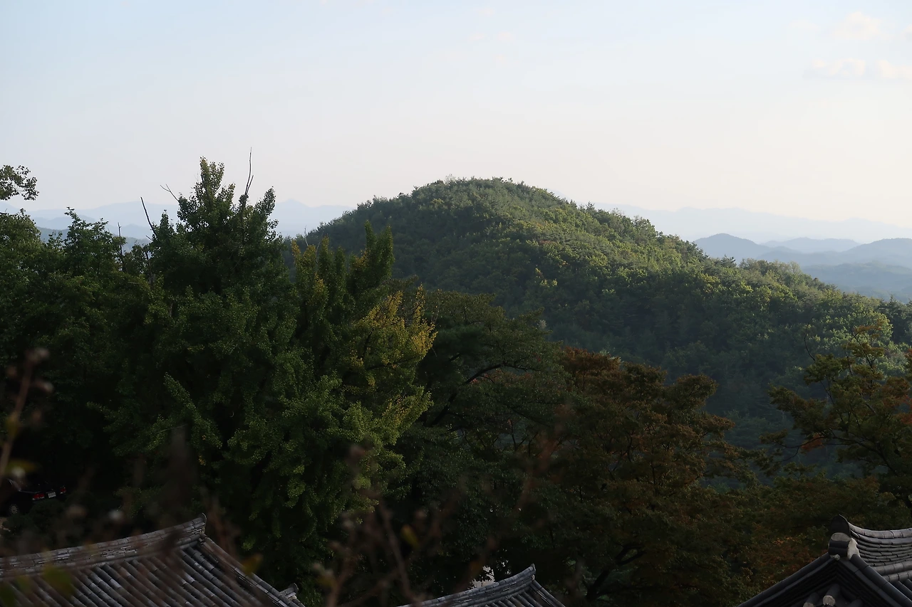 10-8. 무량수전 영역에서 보이는 안산의 모습. 나무가 무성하여 산이 완전히 안보이는 점이 조금 아쉽다.