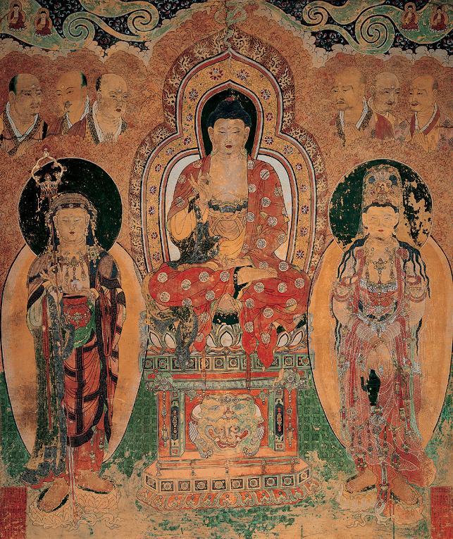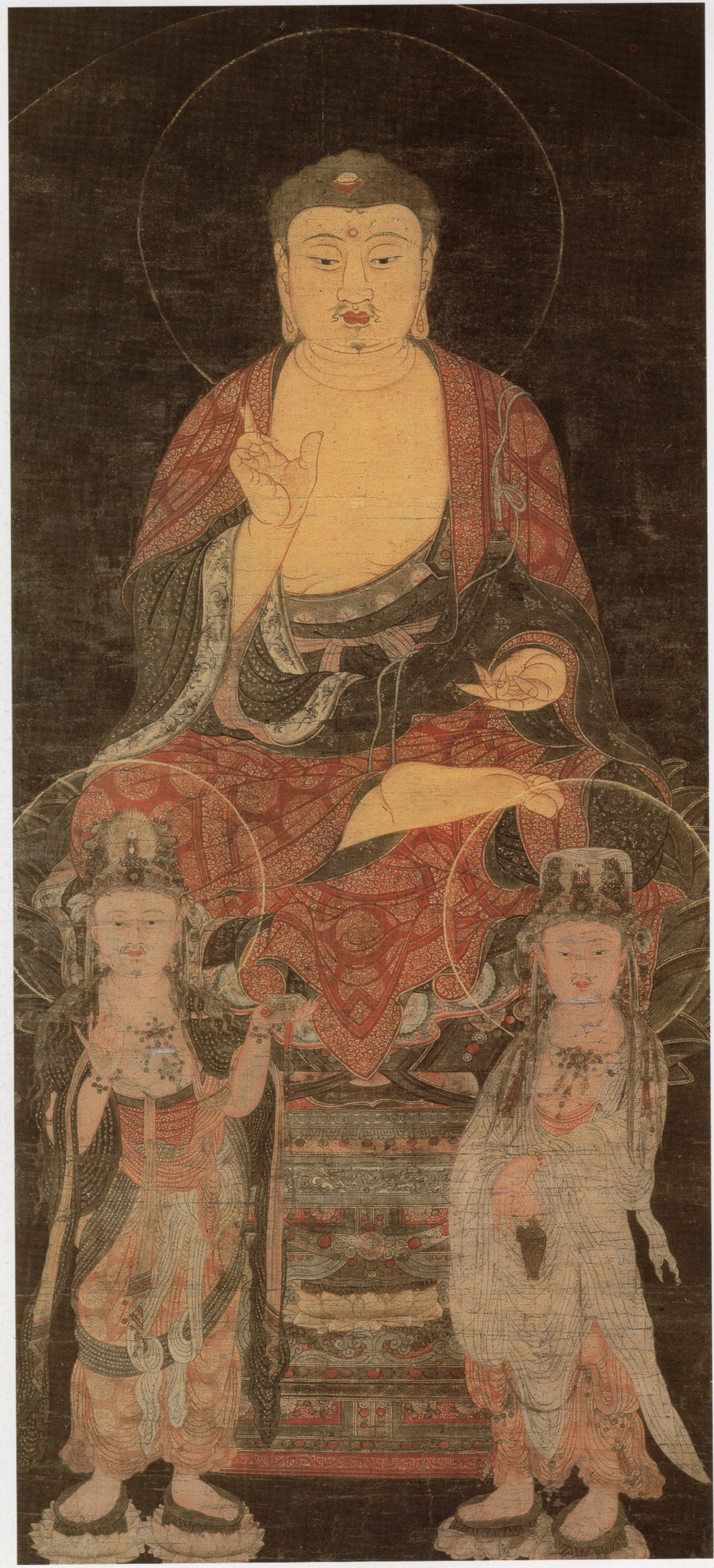 좌우측 불화 모두 아미타불과 좌우 협시보살을 그렸다. 우측의 조선 불화는 아미타삼존 외에도 나한 6위와 타방불들이 작게 묘사되어 있으나 아미타불과 양협시보살이 주축을 이룬다는 점에서 유사하다. 좌측 불화는 두 협시보살의 머리가 본존의 무릎에 오는 정도이나 우측 불화에서는 본존의 어깨 높이까지 올라왔다. 앞에서 본 지장보살도와 마찬가지로 본존의 위엄은 지키고 있으나 원형에 가까운 구도를 택하여 보다 수평적인 관계를 지향하는듯 보인다.