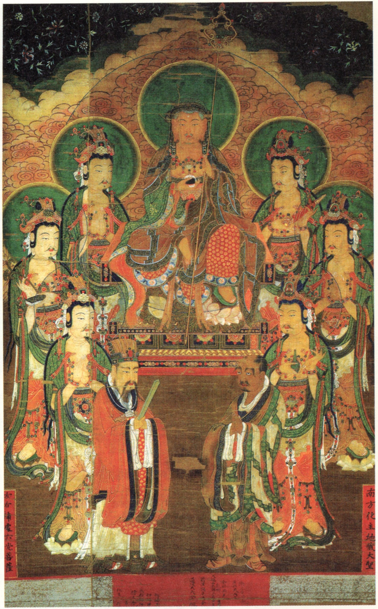 조선 불화에서도 본존은 여전히 화면의 중심을 차지하고 있으며 돋보이게 묘사된다. 그러나 고려 불화의 본존이 감히 범접할 수 없는 존재처럼 묘사된 반면, 조선 불화에서는 보다 가까워진 느낌이다. 아래의 지장보살도를 한번 살펴보자(사진3).