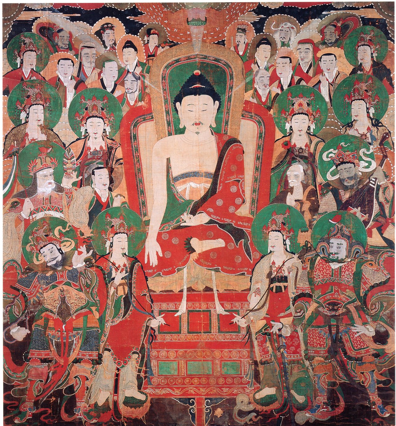 위의 영국사 <영산회상도> 역시 중앙의 석가모니불을 여러 보살과 제석ㆍ범천, 나한 및 사천왕 등이 둥글게 에워싼 모습이다. 비록 보살에 비해 나한과 제석 등이 다소 작게 표현되어 어느정도의 위계질서를 보이고는 있으나 고려 불화 전반에서 보이는 위계성 짙은 구도는 아니다.