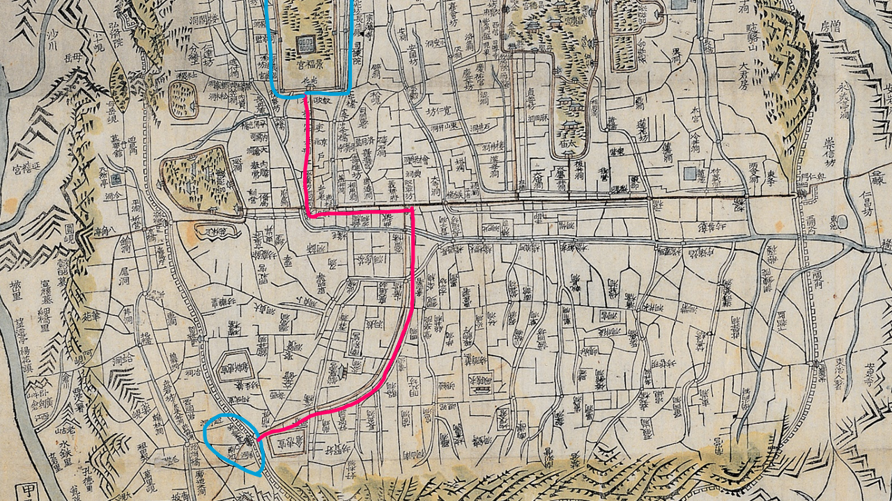 사진4. <수선전도>에 표시된 숭례문과 광화문 사이. 붉고 푸른 표시는 필자가 했음(사진출처 : 위키백과)