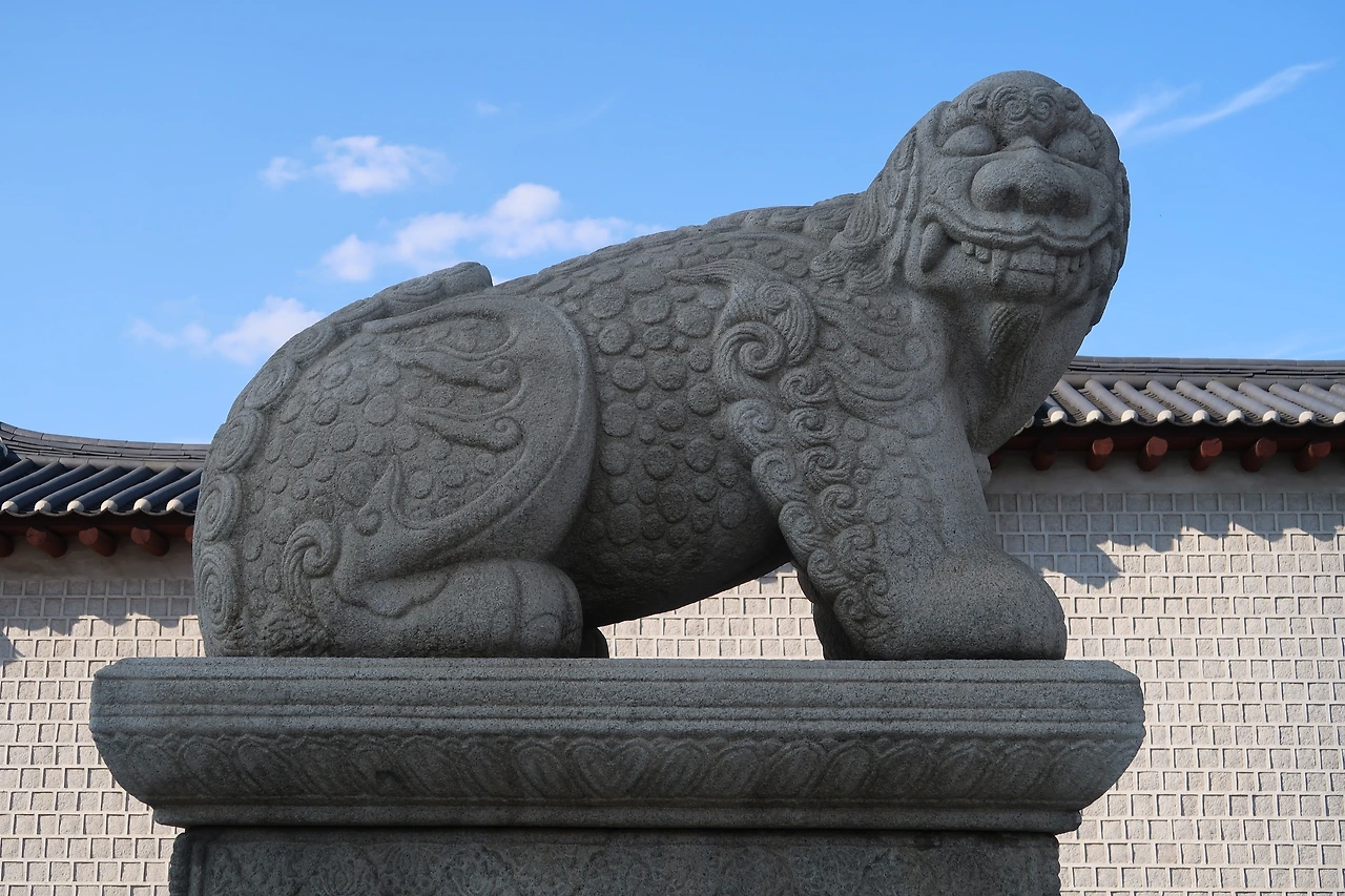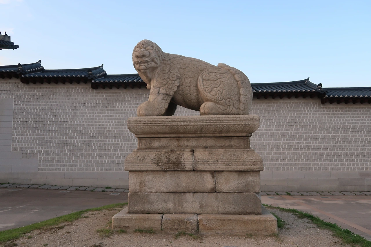사진5. 광화문 앞에 놓여있는 해치 한쌍. 촬영 당시는 월대 복원 이전이라 담장 바로 앞에 놓여있다.