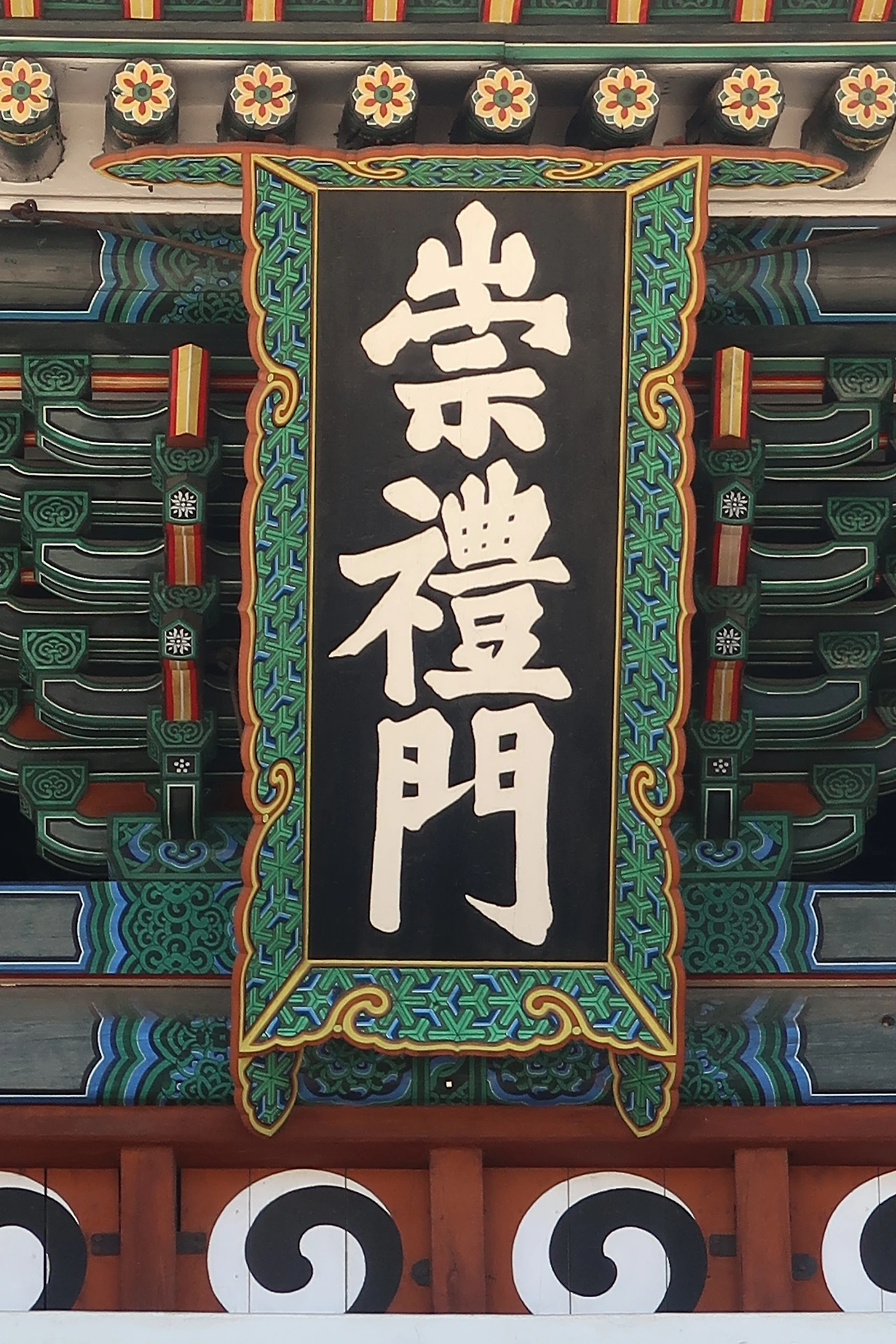 셋째, 숭례문(崇禮門) 현판이다. 여기서 현판에 적은 '숭례崇禮' 는 단순히 예를 숭상한다는 의미로 해석하면 안된다. '崇(숭)'은 불꽃이 타오르는 모습을 본뜬 글자이며, '禮(예)'는 오행에서 남쪽이자 火(화)를 의미하는 글자이다. 이는 불기운에 맞불을 놓아 대응하겠다는 의도로 읽힌다. 현판을 세로로 적은 것 역시 그러한 의지의 표현이라 하겠다(사진3).