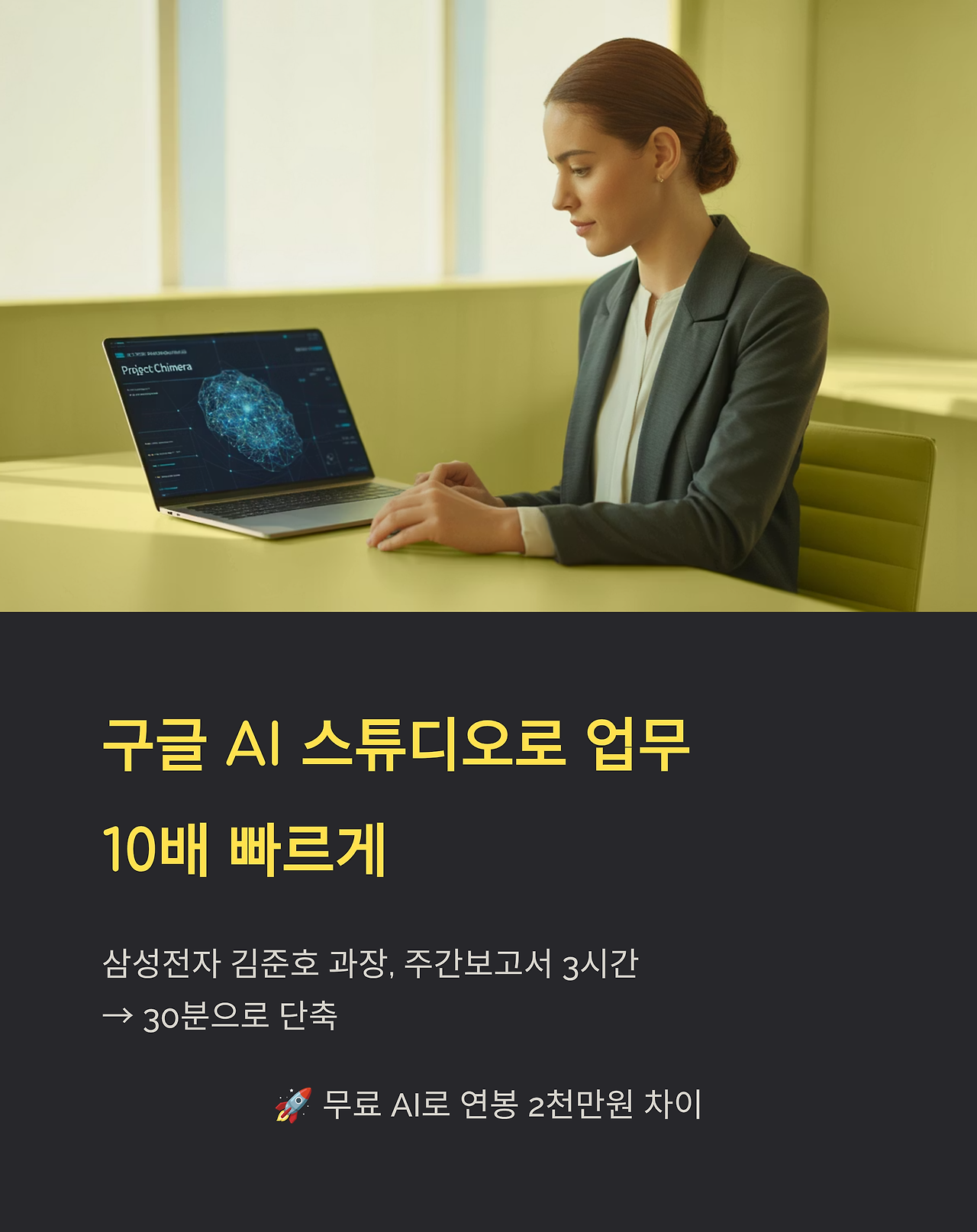 2025년 9월 16일 월요일 아침. 삼성전자 DS부문 김준호 과장(35)은 매주 금요일마다 3시간씩 걸리던 주간 보고서를 단 30분 만에 완성했다. 비밀은 간단했다. 구글 AI 스튜디오를 무료로 활용한 것이다. 그의 옆자리 동료는 여전히 엑셀과 씨름 중이었다. 두 사람의 퇴근 시간 차이는 정확히 4시간. 연봉 협상 테이블에서의 차이는 2000만 원이었다.