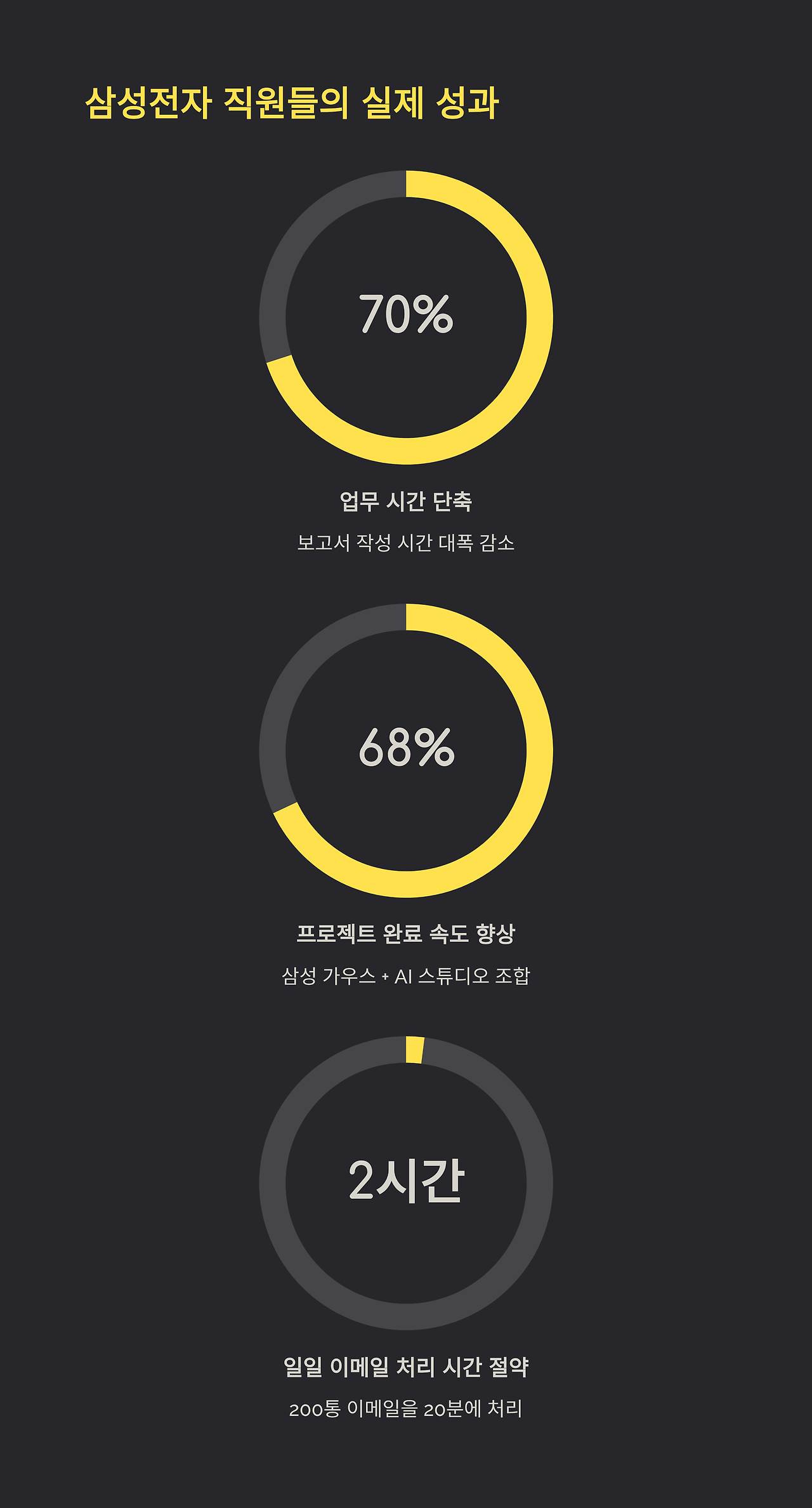 삼성전자가 자체 개발한 '삼성 가우스'와 구글 AI 스튜디오를 함께 활용하는 직원들의 생산성은 가히 폭발적이었다. 내부 문서는 가우스로, 외부 자료 조사와 보고서 작성은 구글 AI 스튜디오로. 이 조합을 활용한 팀의 프로젝트 완료 속도가 평균 68% 단축되었다는 내부 보고서가 나왔다.