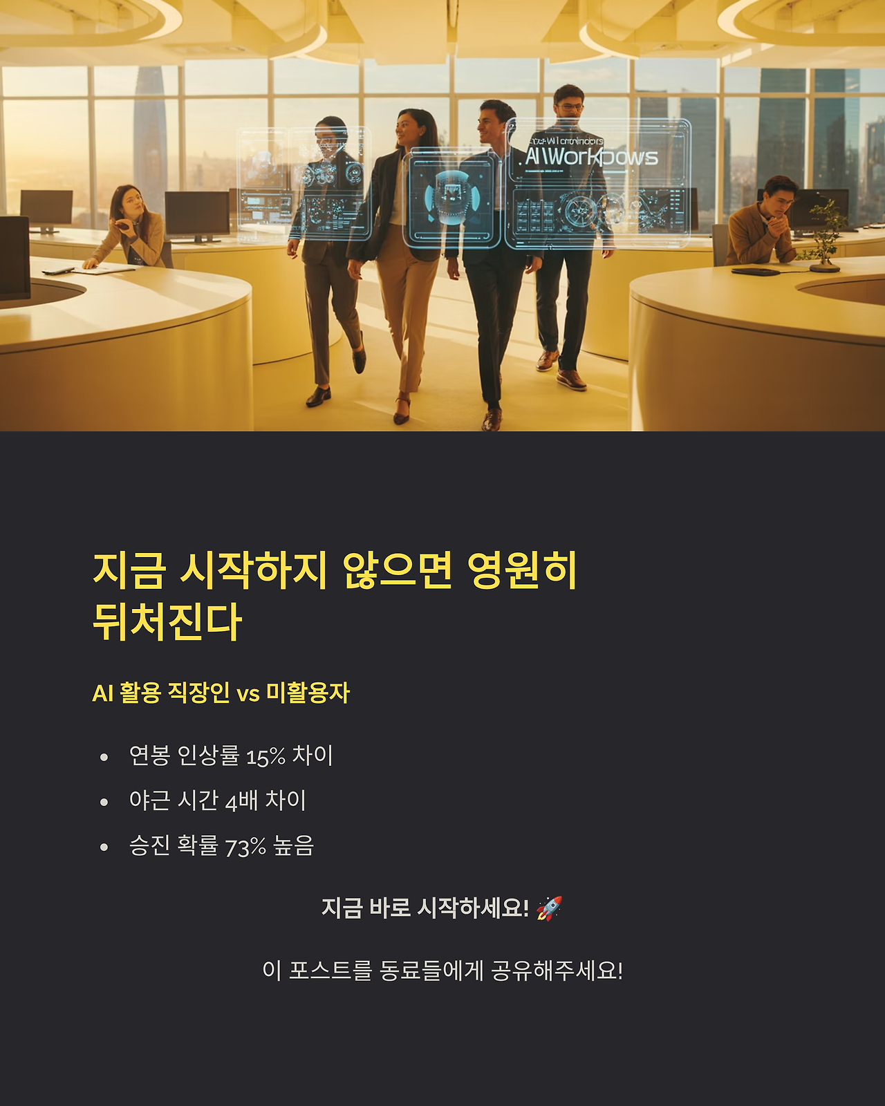 더 놀라운 것은 한국생산성본부의 조사 결과였다. AI 도구 활용 직장인의 평균 야근 시간은 주 3시간, 미활용자는 주 12시간. 무려 4배 차이였다. 연봉 인상률도 AI 활용자가 평균 15% 높았다.