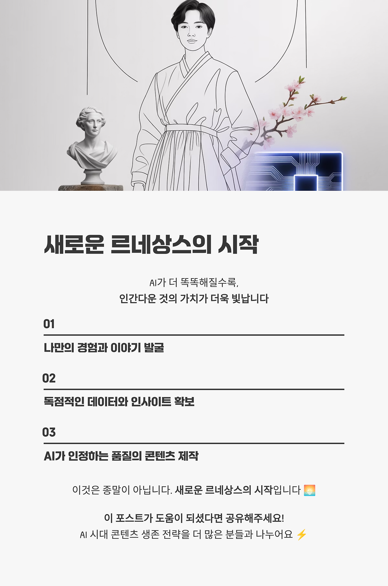 "AI가 만들어낸 완벽한 콘텐츠"보다 "AI와 협업해서 탄생한 독창적인 통찰"이 더 가치 있는 시대가 온 것입니다.