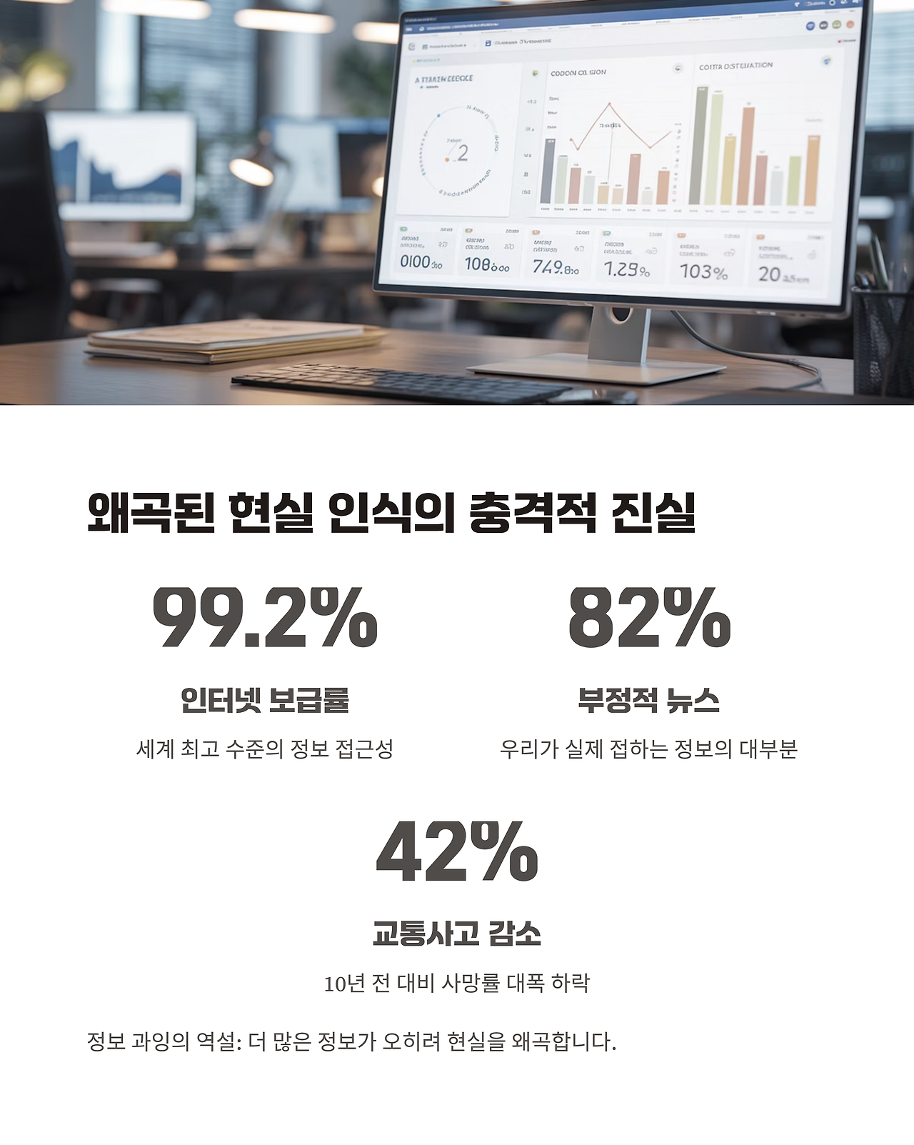 문제의 핵심은 바로 '정보 과잉의 역설'입니다. 한국은 2025년 기준 인터넷 보급률 99.2%, 스마트폰 보유율 96.8%로 세계 최고 수준의 정보 접근성을 자랑합니다. 하지만 통계청 자료에 따르면, 하루 평균 7.4시간을 온라인에서 보내는 한국인들이 실제로 접하는 정보의 82%는 부정적 뉴스입니다. 알고리즘은 우리의 클릭을 유도하기 위해 자극적이고 불안을 조장하는 콘텐츠를 계속 노출시킵니다.