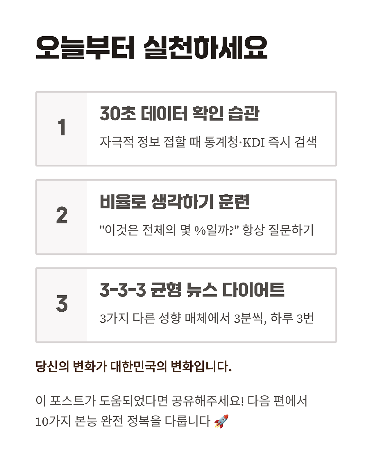 □ 오늘 아침 뉴스에서 가장 자극적이었던 헤드라인 하나를 선택한다 □ 그 헤드라인이 나의 어떤 본능을 자극했는지 파악한다 (10가지 본능 중) □ 30초 데이터 확인: 통계청이나 공신력 있는 기관의 실제 수치를 찾아본다 □ 내 첫인상과 실제 데이터의 차이를 노트에 기록한다