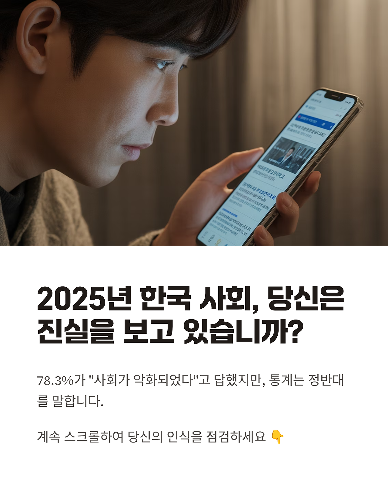 2025년 9월, 한국개발연구원(KDI)이 발표한 '국민 인식 조사' 결과는 충격적이었습니다. 응답자의 78.3%가 "한국 사회가 10년 전보다 악화되었다"라고 답했지만, 실제 통계 지표들은 정반대의 이야기를 하고 있었습니다. 교통사고 사망률은 10년 전 대비 42% 감소했고, 영아 사망률은 OECD 최저 수준으로 개선되었으며, 평균 수명은 84.3세로 역대 최고치를 기록했습니다. 그런데 왜 우리는 이렇게 현실과 동떨어진 인식을 갖게 된 걸까요?