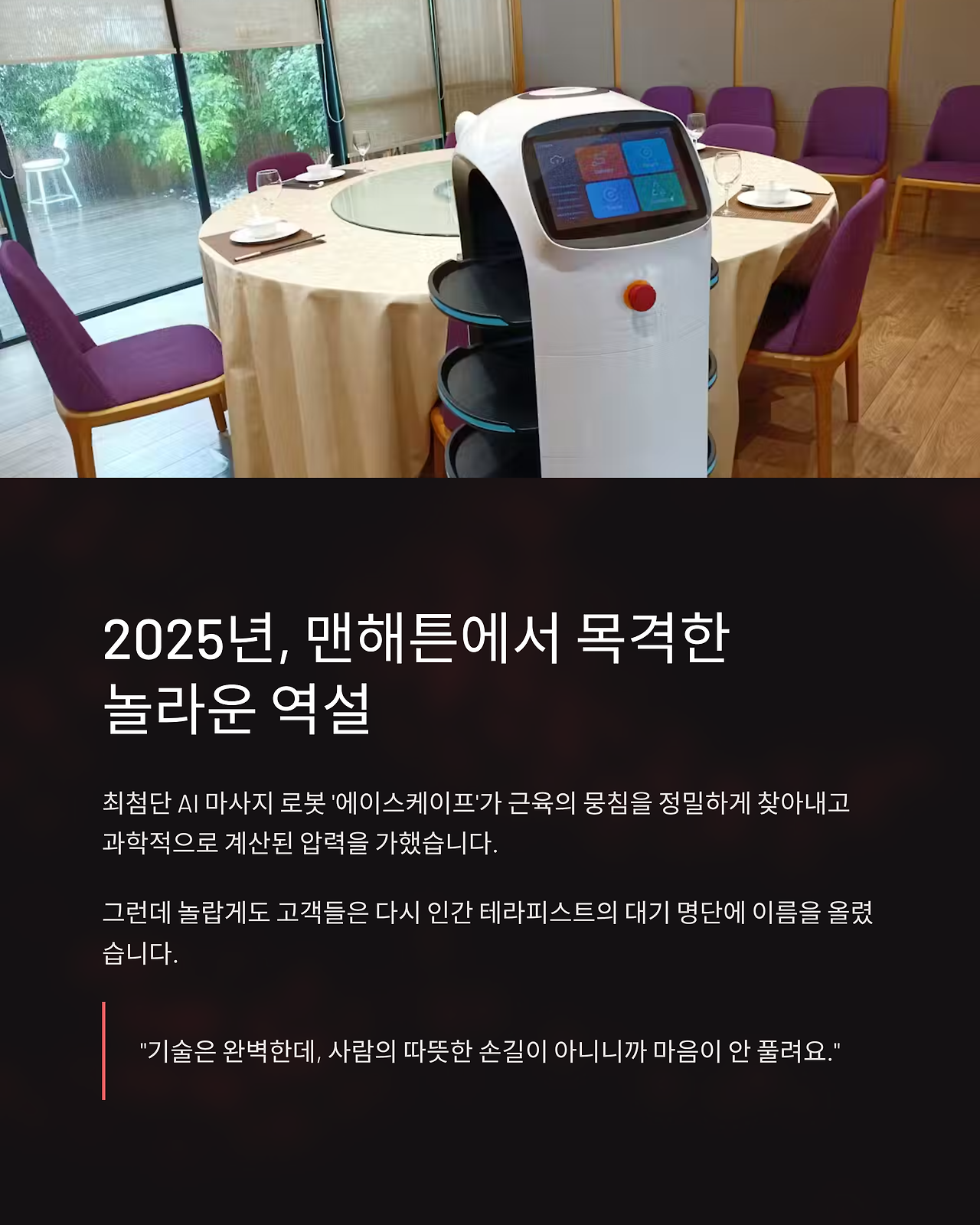 2025년 봄, 저는 맨해튼에서 충격적인 장면을 목격했습니다. 최첨단 AI 마사지 로봇 '에이스케이프'가 설치된 프리미엄 헬스클럽에서 벌어진 일이었죠. 로봇의 정밀한 센서가 근육의 뭉침을 완벽하게 찾아내고, 과학적으로 계산된 압력을 가했습니다. 그런데 놀랍게도 고객들은 다시 인간 테라피스트의 대기 명단에 이름을 올렸습니다. 한 회원의 말이 인상적이었습니다. "기술은 완벽한데, 사람의 따뜻한 손길이 아니니까 마음이 안 풀려요."
