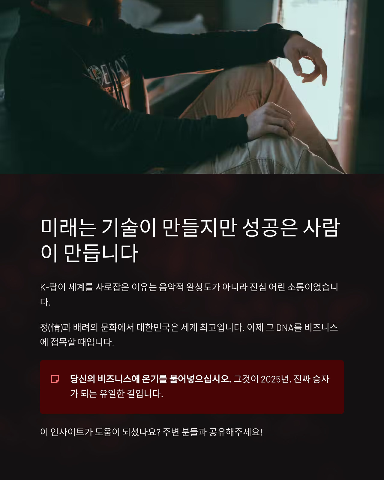 한국 기업들도 이제 정확히 이 지점에 집중해야 합니다. 기술 개발 경쟁에서는 중국의 빠른 속도에 밀릴 수 있습니다. 제조 품질 경쟁에서는 일본과 독일의 장인정신을 따라잡기 어려울 수 있습니다. 하지만 '정(情)'과 '배려'의 문화에서는 대한민국이 세계 최고입니다.