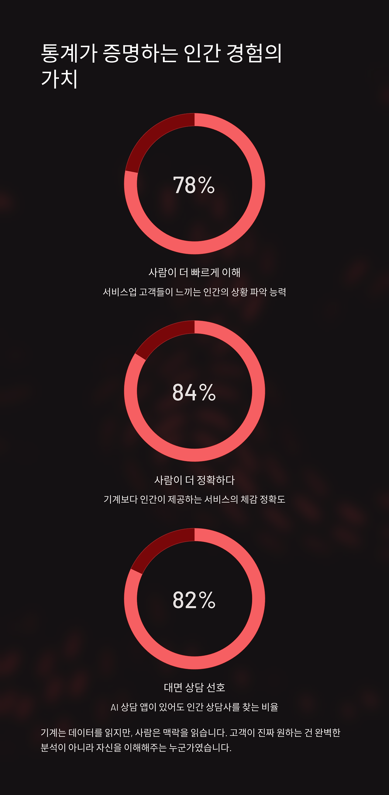 왜 그럴까요? 답은 명확합니다. 기계는 데이터를 읽어내지만, 사람은 맥락을 읽어냅니다. 고객이 진짜 원하는 건 완벽한 데이터 분석이 아니라, 자신의 상황을 이해해 주는 누군가였던 겁니다.