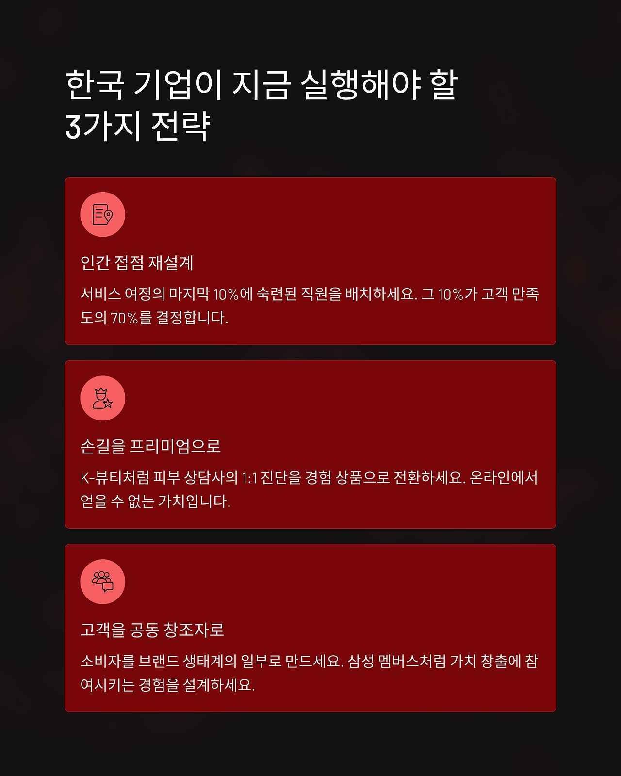 K-뷰티 기업들의 성공 사례를 보세요. 단순히 화장품 제품만 파는 게 아닙니다. 매장에 방문한 고객의 피부를 피부 상담사가 직접 진단하고, 1:1 맞춤형 설루션을 제시합니다. 이 경험은 온라인 쇼핑몰에서는 절대 얻을 수 없는 것입니다.