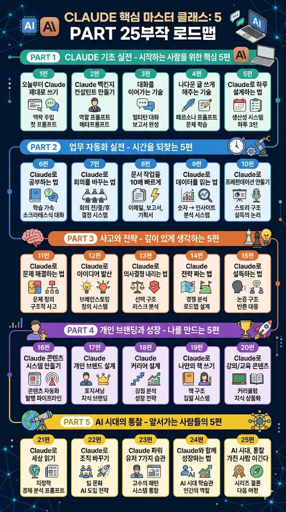 이 시리즈는 Claude와 함께 세계를 읽고, 개인의 생존 전략을 설계하는 25편의 여정입니다. 구독하시거나 팔로우를 하시고 난 후 댓글, 하단에 응원해 주시고, 개인 메일을 남겨 주시면 클로드 글쓰기의 최고 전문가 마스터 시리즈와 메타프롬프트 자동화 생성기를 별도로 보내 드리겠습니다.