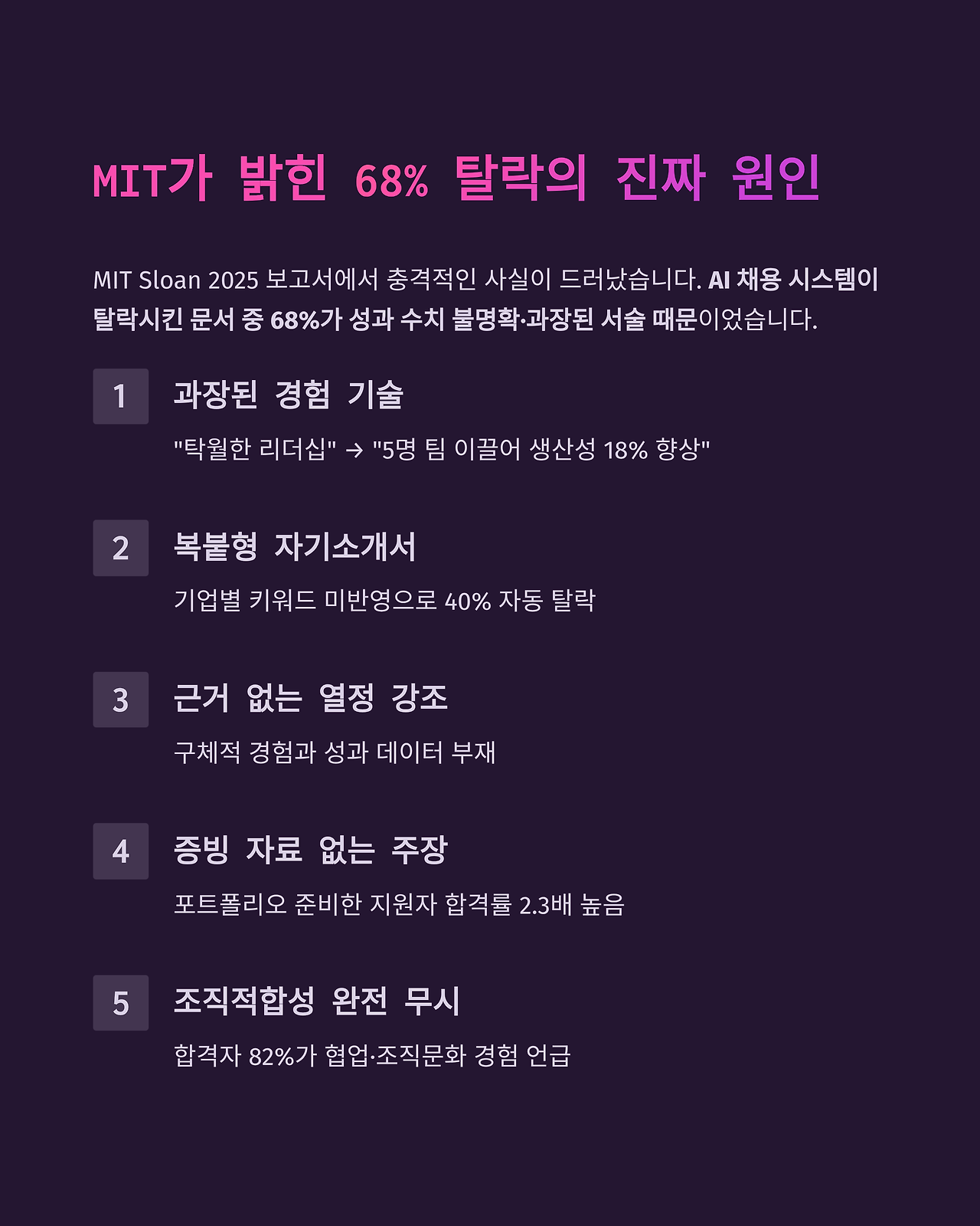 **"AI 채용 시스템이 탈락시킨 문서 중 68%가 성과 수치 불명확·과장된 서술 때문"**이었다는 거예요.