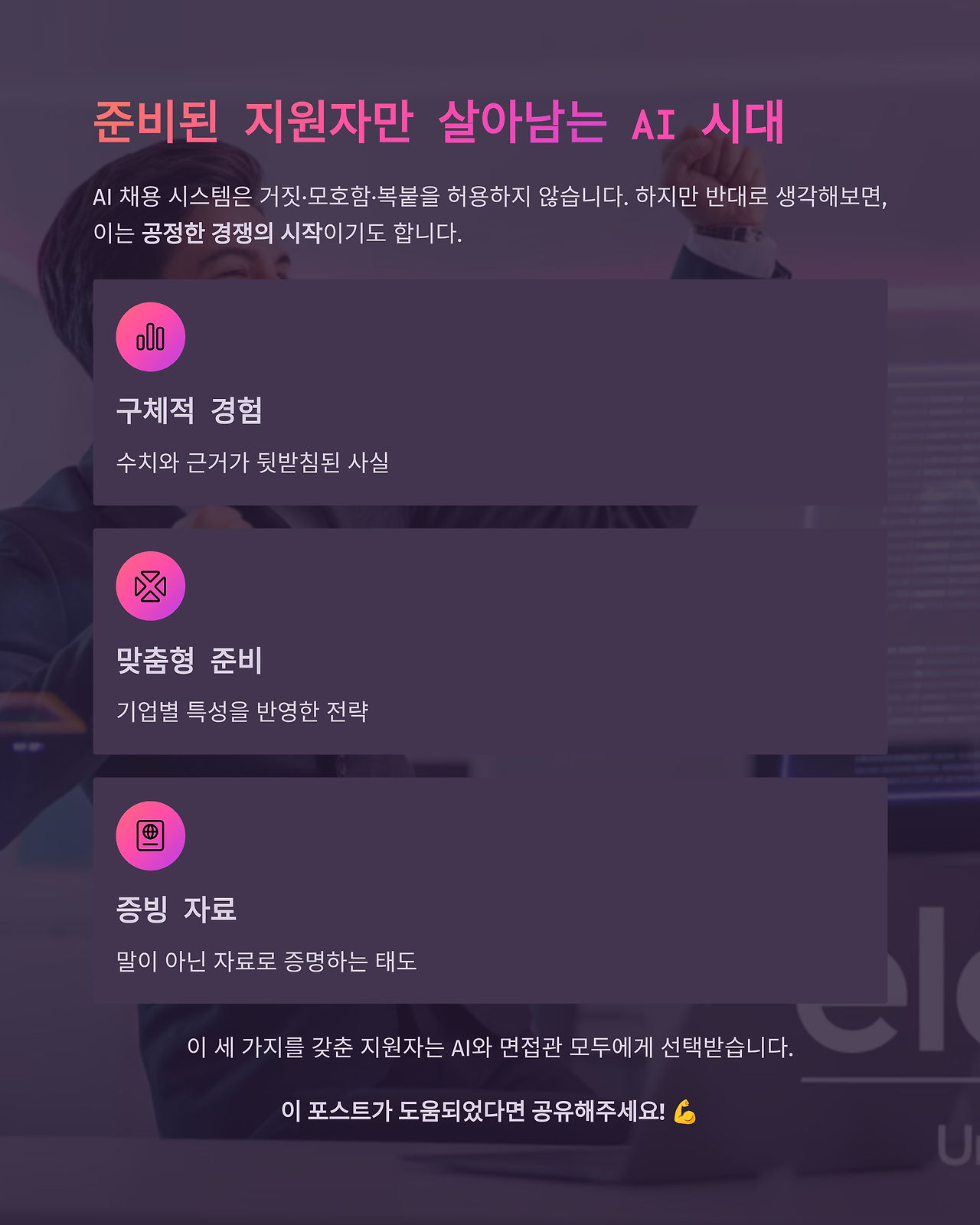 AI 채용 시스템은 지원자의 작은 허점도 놓치지 않거든요. 한 줄의 과장된 이력, 모호한 표현, 준비 없는 답변이 단 몇 초 만에 탈락으로 이어져요.