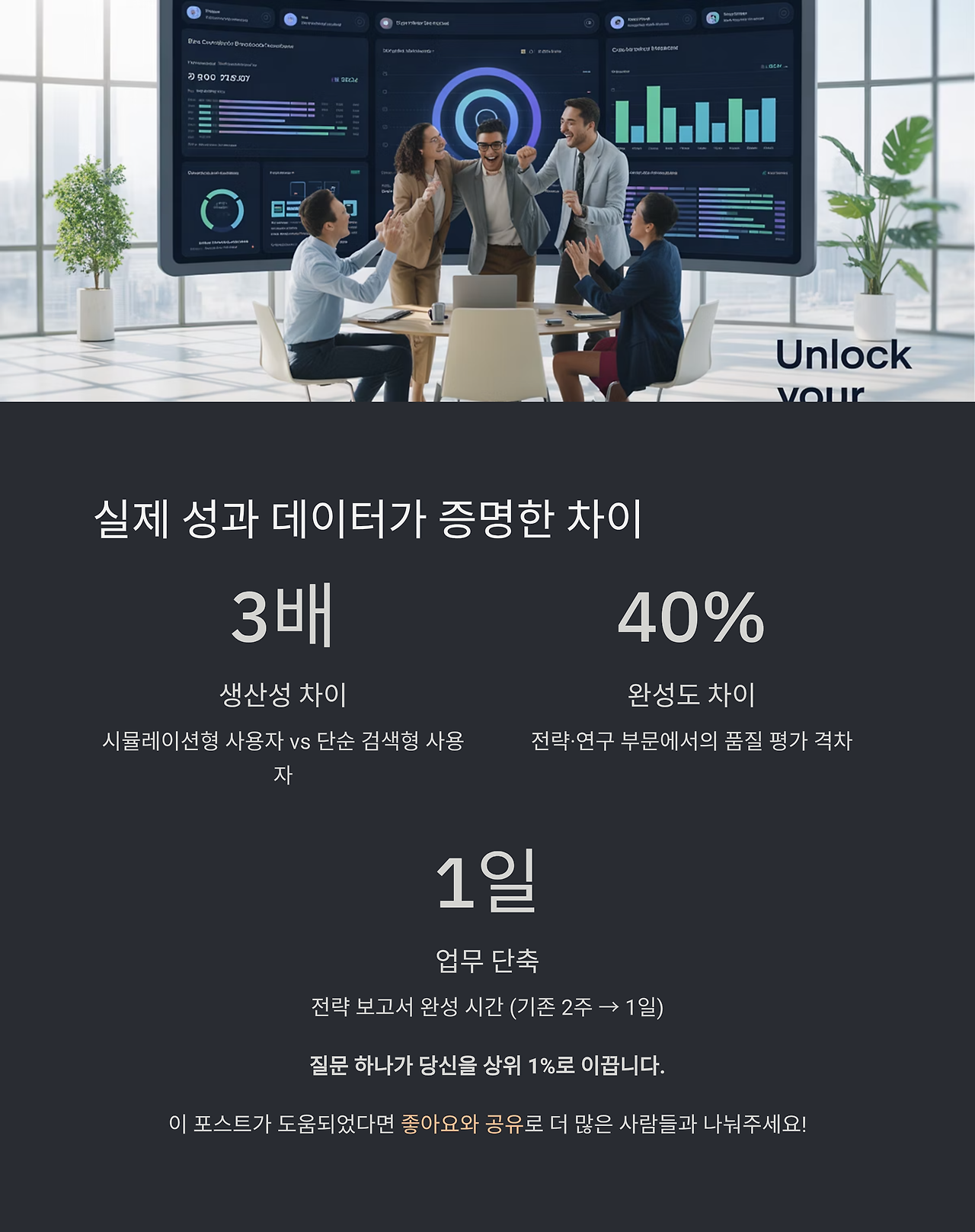 MIT의 2025년 보고서에 따르면, 단순 검색형 사용자는 ‘시뮬레이션형 사용자’에 비해 **생산성이 3배 낮았습니다.** 특히 전략·연구 부문에서는 완성도 평가가 40% 이상 차이가 났습니다. 결국 같은 도구를 쓰더라도 질문의 질이 성과를 좌우한다는 뜻입니다.