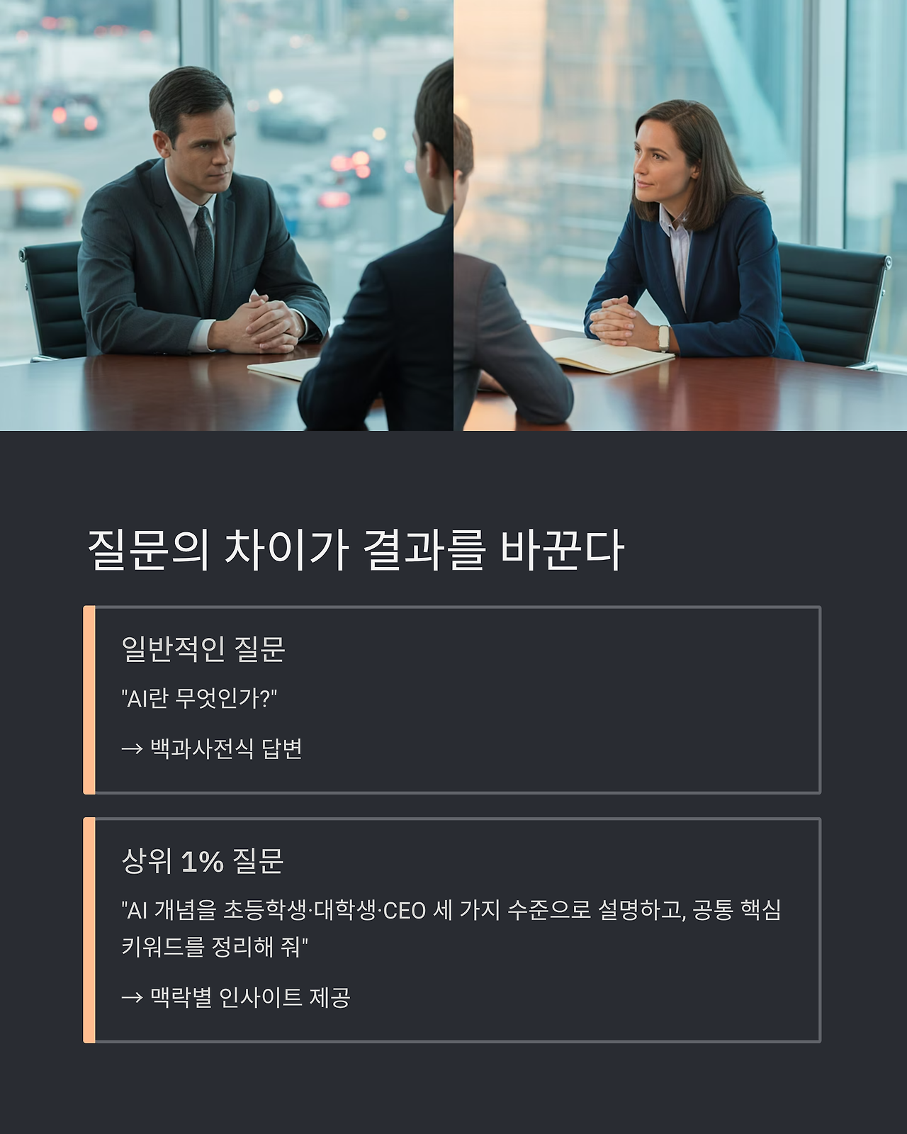 ChatGPT는 단순한 자동응답기가 아닙니다. 예를 들어 "AI란 무엇인가"라고 묻는다면 백과사전식 답변이 돌아옵니다. 그러나 상위 1%는 이렇게 묻습니다.