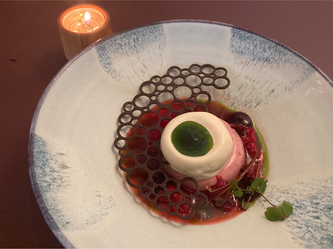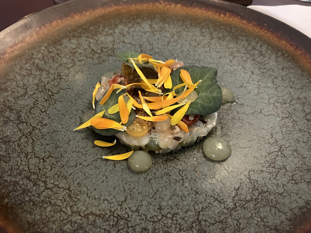 첫 번째 메뉴는 고등어, 토마토, 오이와 식용 꽃과 젤리 소스로 이루어진 고등어 타르타르 같은 느낌이었다.