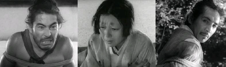 <라쇼몽>의 다조마루는 자신이 사무라이로써 당당한 결투를 통해 무사를 죽였다고 주장했다. 무사의 아내는 남편이 자신의 보는 경멸스러운 눈을 이기지 못하고 죽였다고 했으며, 무사는 아내의 단도로 스스로 목숨을 끊었다고 증언한다.
