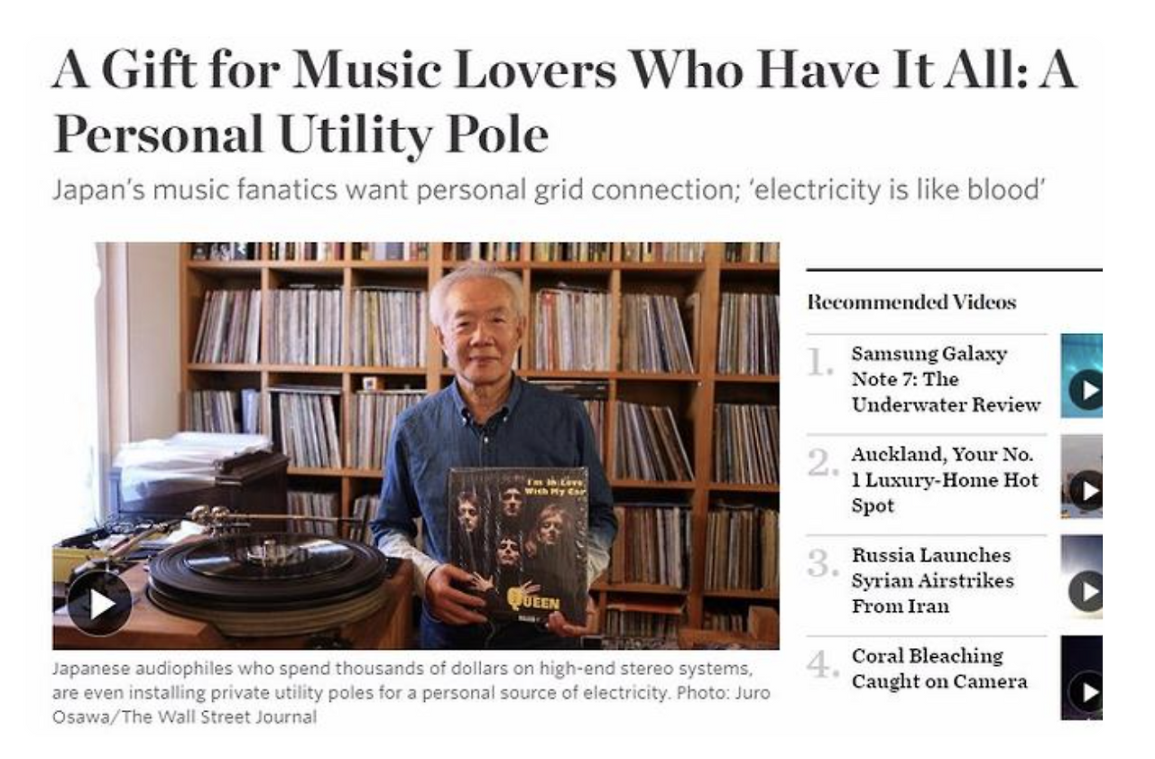 변호사로 일하는 모리타 타케오 씨는 미국제 앰프 외에 극장에서 쓰였던 1960년대 독일제 스피커, 금과 은을 사용한 일본제 케이블 외에도 다양한 고급 오디오 기기를 소유하는 것에 만족하지 않고 단 1%로라도 더 좋은 음질을 들을 수 있으면 하는 마음에 사비를 털어 집 앞에 전봇대를 세웠다. 전력에 따라 음질이 달라질 거라고 믿었기 때문이다.