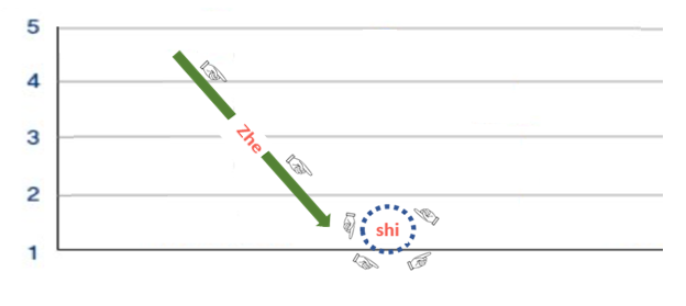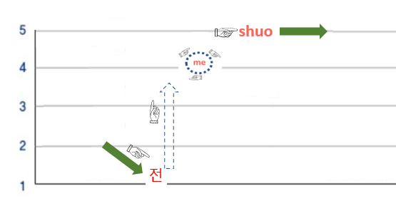 ④ [ zěnme shuō ]의 발음 요령 : [ zěnme: 어떻게 ]는 [ 3성 + 경성 ]의 발음이다. 문장 도중에 나오는 3성은 반3성, 즉 가장 낮은 발음이다. 그 뒤에 나오는 경성은 4도의 위치다. 높은 곳이므로, 복근을 얼른 살짝 당겨줘야 한다. 1도에서 4도로 올라가는 시간 간격이 약간 필요하다. 경성은 아주 가볍게, 순식간에 소리를 내주고 지나간다. 그런데 그 뒤에 나오는 [ shuō ]는 1성, 즉 5도의 위치다. 4도와 5도는 아주 가깝다. 즉 [ ...me shuō ]는 사이에 간격을 두지 말고 붙여서 읽는 것이 리딩의 요령이다.