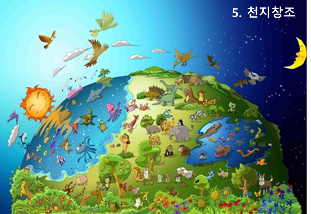 반고는 엄청난 속도로 무럭무럭 키가 큰다. 우주는 그만큼 넓어진다. 그리고 어느 순간 반고는 자신을 희생하여 삼라만상을 창조한다.(그림 4) 왼쪽 눈은 해가, 오른쪽 눈은 달이 된다. 눈물은 별이, 땀은 호수가, 피는 강물이, 털은 초목이, 호흡은 바람이 된다.(그림 5)