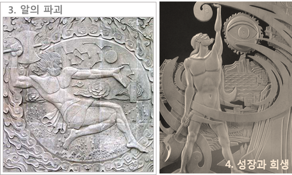 알 속에서 혼수상태(그림 1, 2)로 지내던 반고는 어느 순간 도끼로 알을 깨고(파괴) 세상에 나온다.(그림 3) 파괴의 순간은 새로운 창조의 시작이었다. 그가 떠받친 알껍데기의 절반은 하늘이 되고 절반은 땅이 된다.