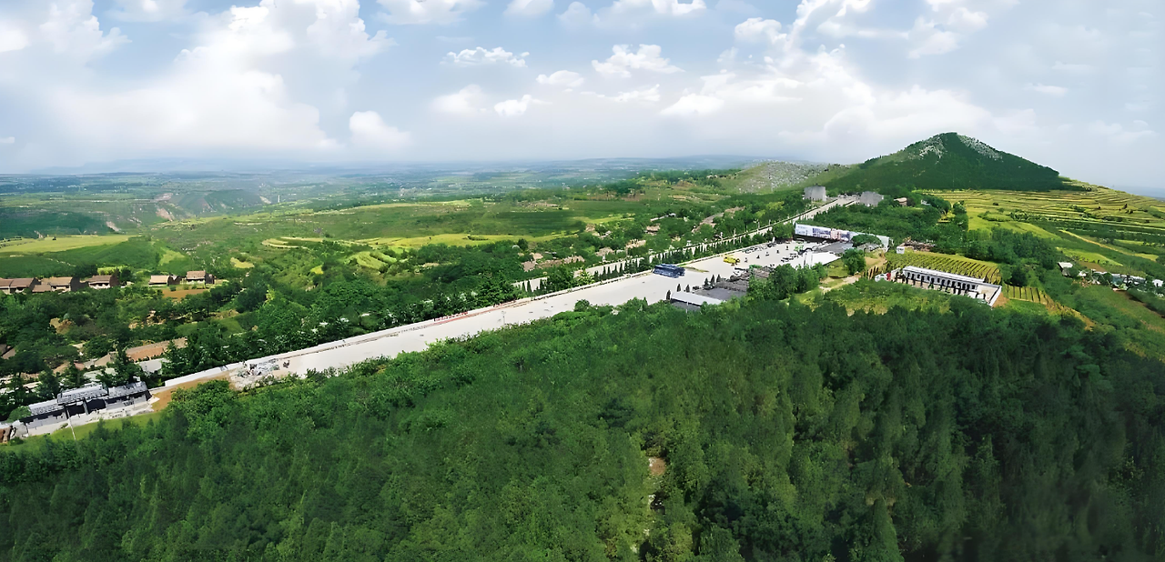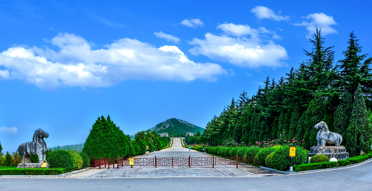먼저 노폭이 50m도 넘어 보이는 어마어마하게 넓고 커다란 길이 보인다. 그 길 중간쯤에 두 개의 원추형 봉우리가 좌우에 있다. 그리고 멀리 북쪽에 삼각형으로 우뚝 솟은 높은 봉우리가 보인다. 고종과 무측천의 지하궁전이 숨어있다는 바로 그 양산이다.